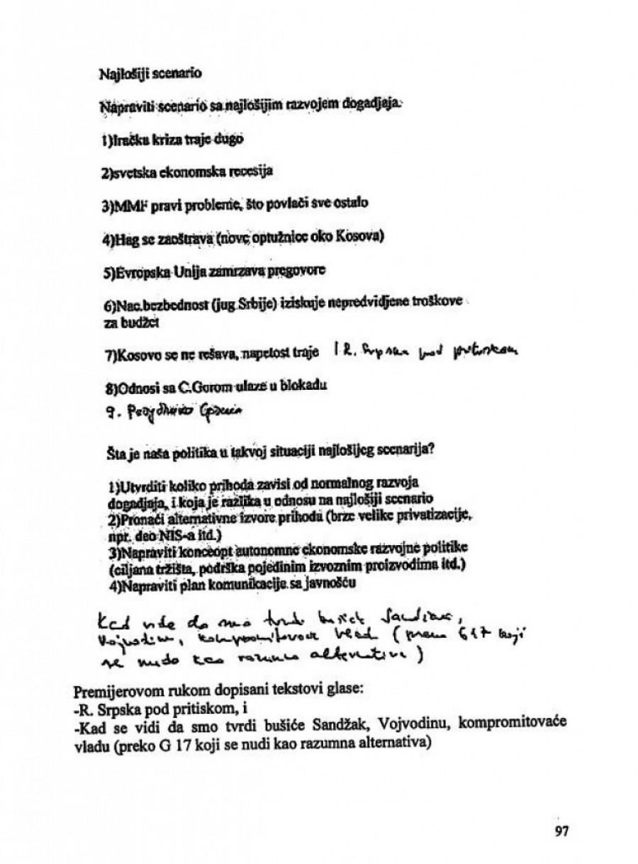 Foto: www.profimedia.rsĐinđić je taj papir nazvao "scenarijom sa najlošijim razvojem događaja", nabrajajući redom šta nas sve čeka u narednom periodu, od ekonomskih pritisaka (preko MMF) i stavljanja na led pregovora sa EU do ucena i pritisaka vezanih za Hag, Kosovo, Republiku Srpsku... Premijer je rukom dopisao detalje za koje je smatrao da su posebno važni.