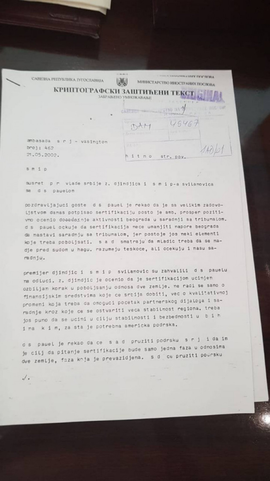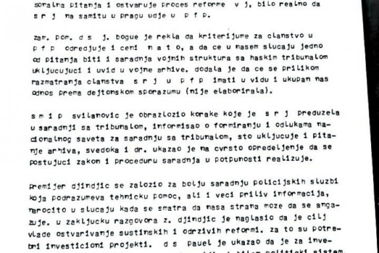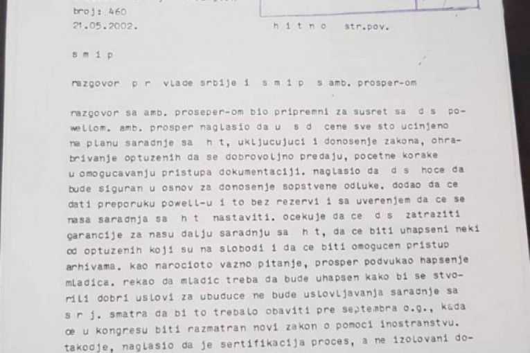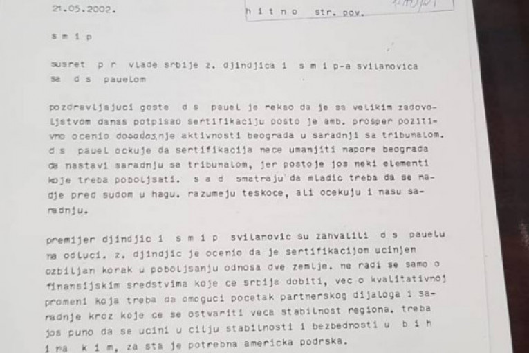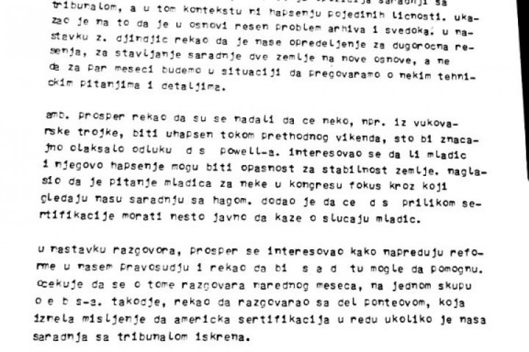 Uz papir koji je sastavio sam Đinđić, objavljujemo i detaljne izveštaje sa sastanaka koje su Đinđić i Goran Svilanović imali u Vašingtonu u maju 2002. sa državnim sekretarom Kolinom Pauelom i američkim ambasadorom koji se bavio pitanjem ratnih zločina Pjerom Rišarom Prosperom. Manje od godinu dana nakon toga Đinđić je ubijen. Izveštaje je u Beograd slao tadašnji otpravnik poslova u našoj ambasadi (ambasadora nismo imali) Ivan Živković.