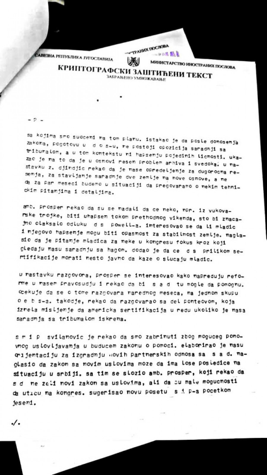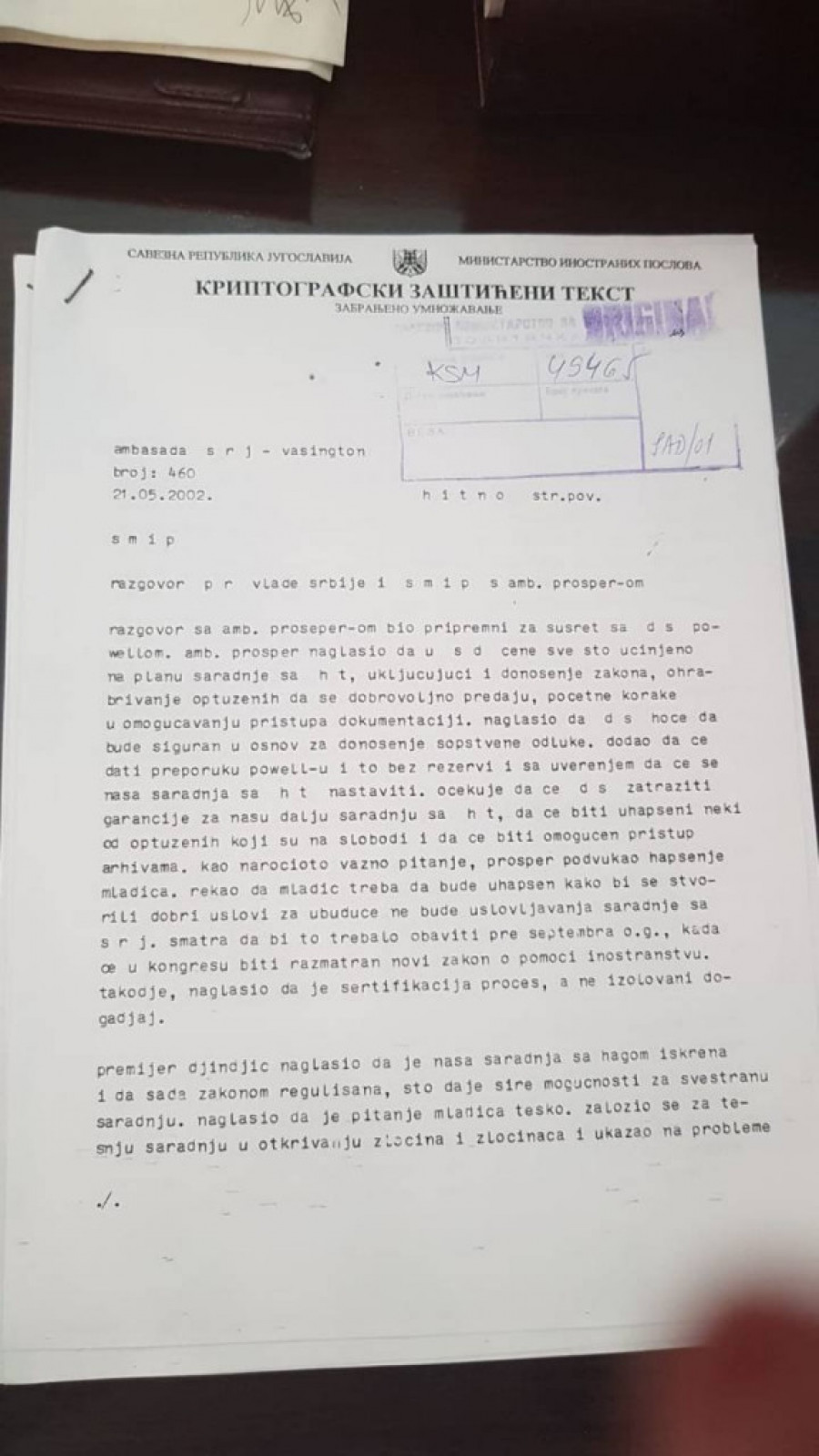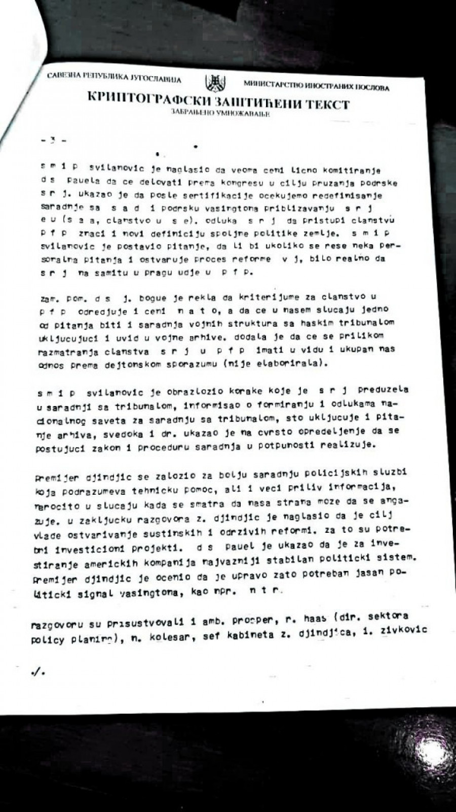 Uz papir koji je sastavio sam Đinđić, objavljujemo i detaljne izveštaje sa sastanaka koje su Đinđić i Goran Svilanović imali u Vašingtonu u maju 2002. sa državnim sekretarom Kolinom Pauelom i američkim ambasadorom koji se bavio pitanjem ratnih zločina Pjerom Rišarom Prosperom. Manje od godinu dana nakon toga Đinđić je ubijen. Izveštaje je u Beograd slao tadašnji otpravnik poslova u našoj ambasadi (ambasadora nismo imali) Ivan Živković.