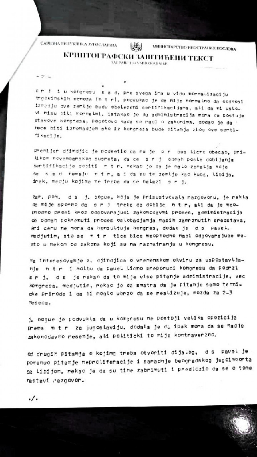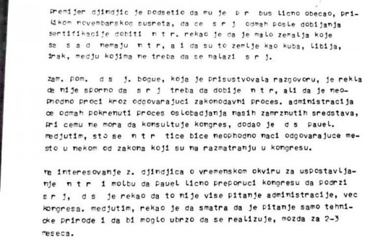 Izveštaje iz Vašingtona slao je u MSP otpravnik poslova Ivan Živković, pošto SRJ tada nije imala ambasadora u SAD