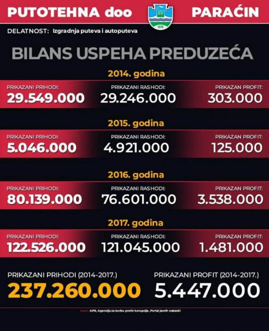 Dakle, prema podacima iz APR Putotehna doo iz Paraćina je u periodu od 2014.-2017. godine prihodovala 237.260.000 dinara. Kako smo saznali firma Putotehna tokom 2014. i 2015. nije imala zaposlene radnike, a tek krajem 2016. je zaposlila prve radike. Postavlja se pitanje kako je firma koja se bavi putarskim radovima, uspevala da završi poslove i da izgradi puteve kada nije imala zaposlene? Tako, 2014. godine kada je osnovana Putotehna je prihodovala 29.549.000, a rashodovala 29.246.000 dinara. Naredne dve godine Putotehna je radila takođe bez ijednog zaposlenog, ali je za te dve godine prihodovala preko 85 miliona dinara, a rashodovala preko 80 miliona dinara bez obzira na to što nije imala nijednog zaposlenog. 2017. godine prihodi Putotehne su značajno porasli na čak 122 miliona dinara dok se profit smanjio na samo milion i po dinara. Prema ovom ispada da je Putotehna za četiri godine zaradila samo 5,5 miliona dinara ili 2,3 posto od ukupnih prihoda, što je krajnje čudno za ovu vrtu delatnosti gde se profit kreće u iznosu većem od 10 procenata. Kod ovog preduzeća nije samo to čudno već je i čudno kako su uspevali da pobeđuju na javnim nabavkama bez radnika koji su mogli da garantuju završetak posla.