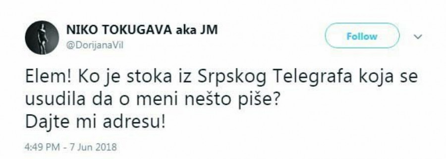 Ništa gore nego kad neuki primitivac uobrazi da je intelektualac i elita, kad glupa osoba glumi da je pametna ili kad baba glumi tinejdžerku. A kod dotične imamo sva tri slučaja. Pa jel bar došla da lupa redakciju, ili zna da lupa samo po tviteru?