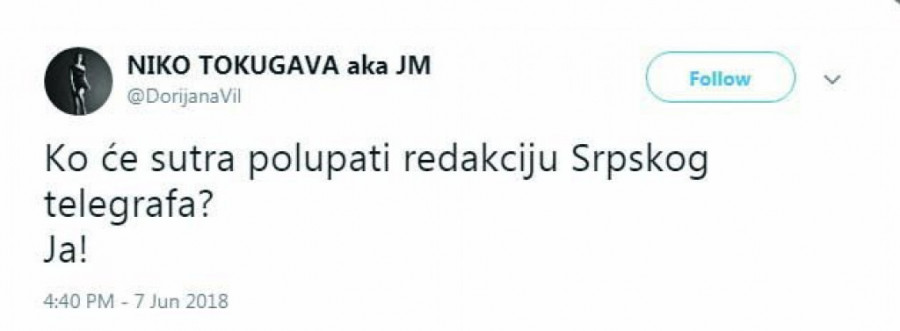 - Ko će sutra polupati redakciju Srpskog telegrafa? Ja!