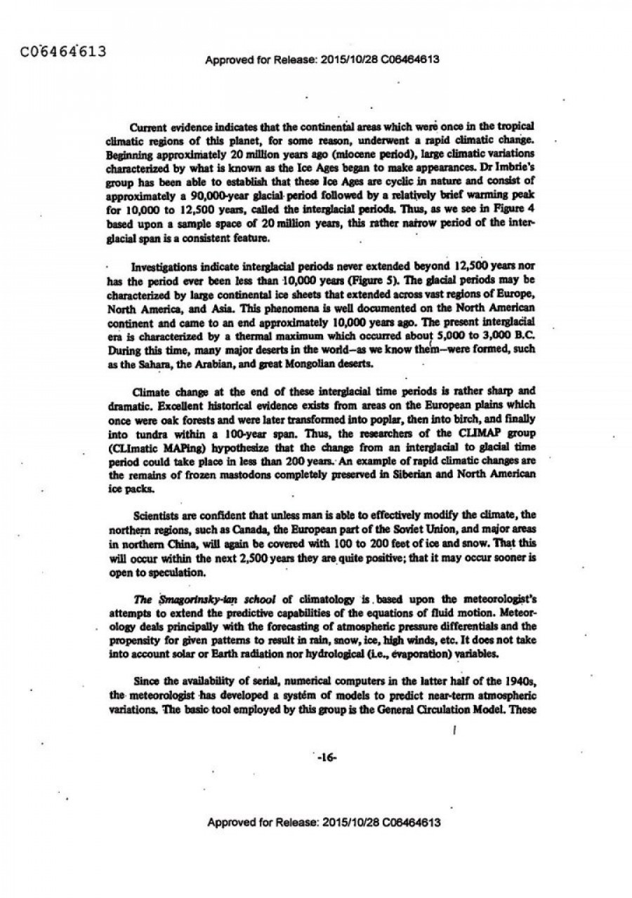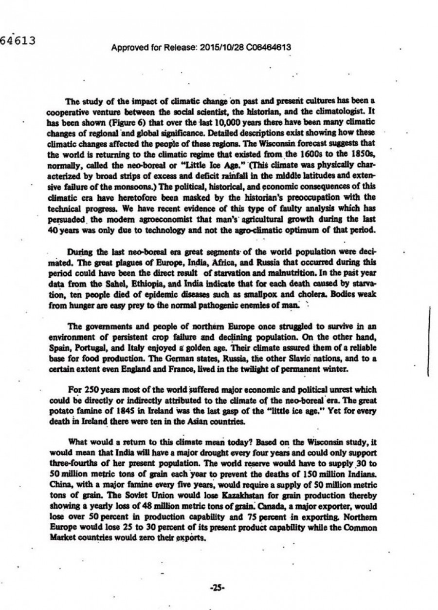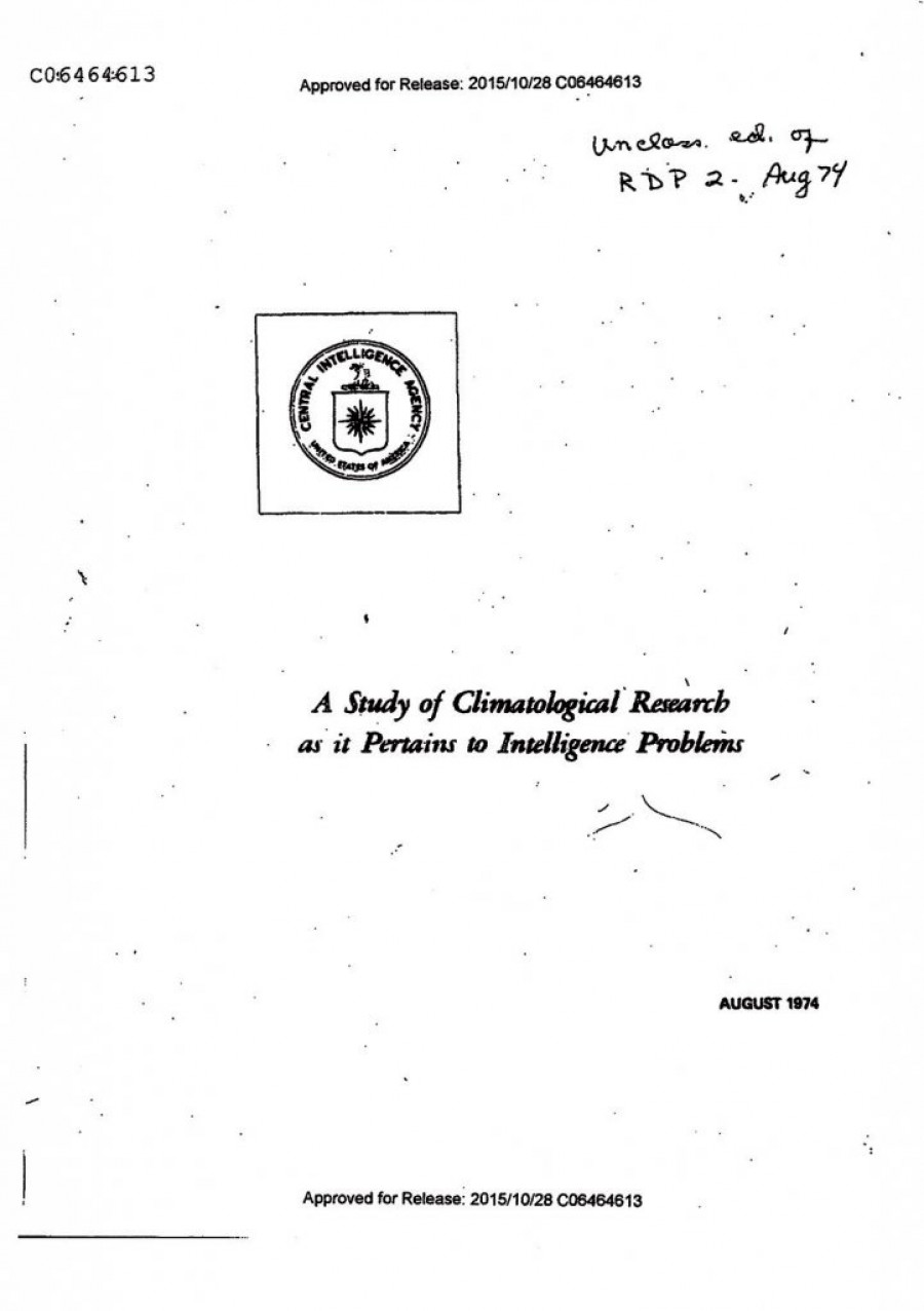Izveštaj tajne službe SAD nosi naziv "Studija klimatoloških istraživanja i njihov uticaj na obaveštajne probleme". CIA se, dakle, još pre pola veka ozbiljno bavila klimatskim promenama, a verovatno i traženjem načina da se utiče na klimu i to koristi kao neka vrstu oružja.