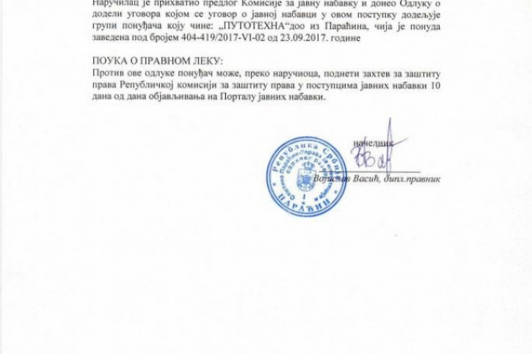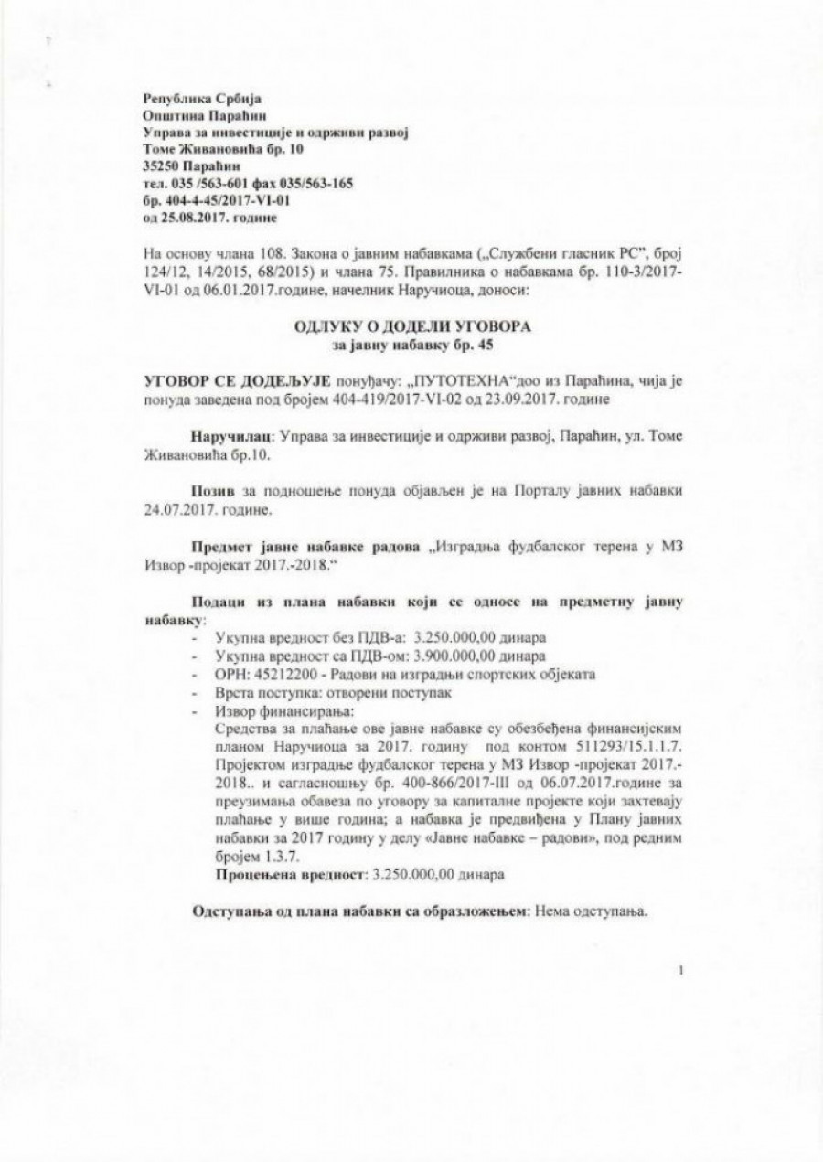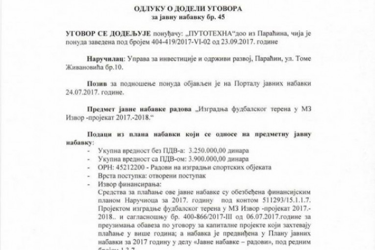 Interesantno je da je posao izgradnje seoskog fudbalskog igrališta, koji se sastoji od zemljanih radova i ozelenjavanja terena, dobila lokalna kompanija Putotehna, koja inače kao prema nekom nepisanom pravilu dobija maltene sve poslove asfaltiranja na javnim nabavkama u Paraćinu u poslednjih nekoliko godina. Putotehna je prema dostupnim podacima APR-a osnovana početkom 2014. godine sa osnivačkim kapitalom od 100 dinara, a već iste godine novoosnovana kompanija je od lokalnih javnih preduzeća dobila poslove vredne maltene 30 miliona dinara i to bez ijednog zaposlenog radnika!