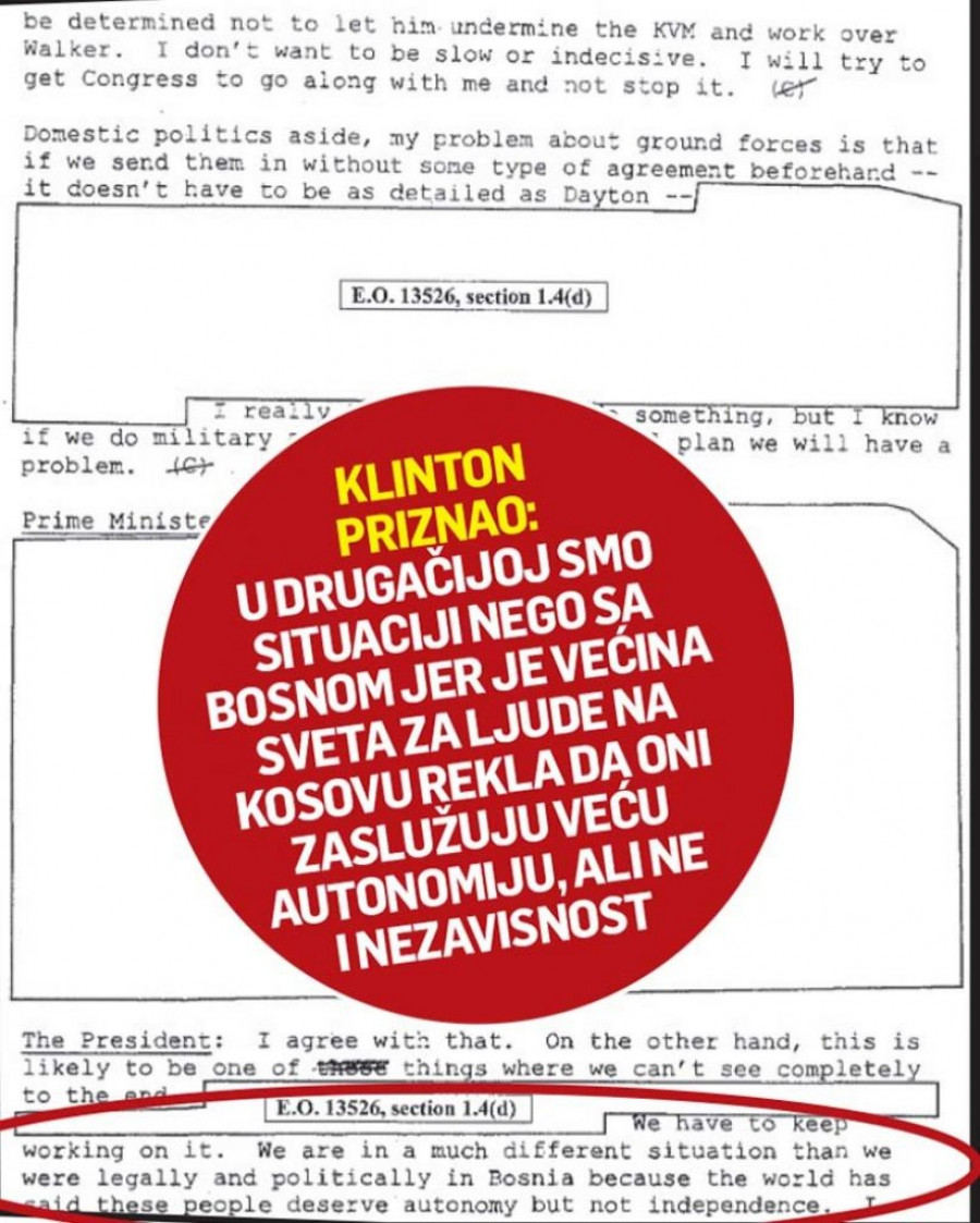 - Potpuno se slažem sa tobom u vezi sa svim. Očigledno moramo da uradimo nešto i budemo spremni da sprovedemo akciju. Pokušaću da ubedim Kongres da to podrži. Problem mi je jedino ideja ulaska trupa na Kosovo jer mi u vezi s tim pitanjem treba neka vrsta sporazuma. Zaista moramo da uradimo nešto jer bi vojna akcija bez političkog plana bila problematična. Ovo bi trebalo da bude stvar koju ćemo dovesti do kraja. U drugačijoj smo situaciji nego sa Bosnom jer je većina sveta za ljude na Kosovu rekla da oni zaslužuju veću autonomiju, ali ne i nezavisnost - priznao je tada Klinton svom prijatelju, čime je ujedno i pokazao da Amerika nije birala sredstva da besramnom kampanjom i silom dovede do toga da mnogi prihvate jednostrano proglašenje nezavisnosti Kosova.