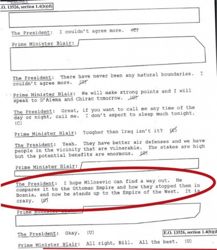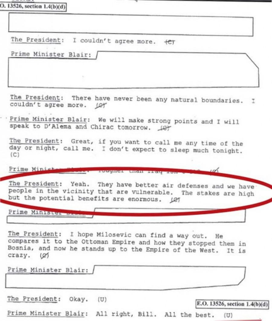 Ostatak izjave britanskog šefa vlade ostao je skriven jer SAD imaju obavezu da posle nekog vremena skinu oznaku poverljivosti samo sa onoga što je rekao njihov lider, ali ne i sa ostalih. Međutim, veruje se da u nastavku on govori o Miloševiću, zbog čega se Klinton nadovezuje najžešćim pretnjama.