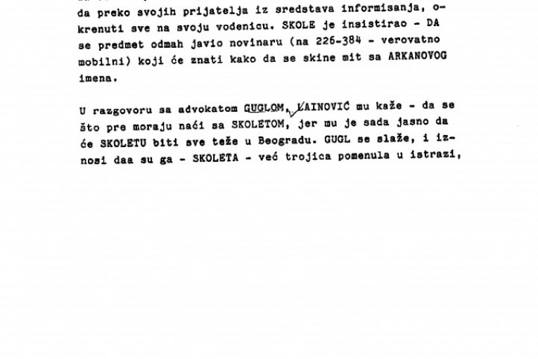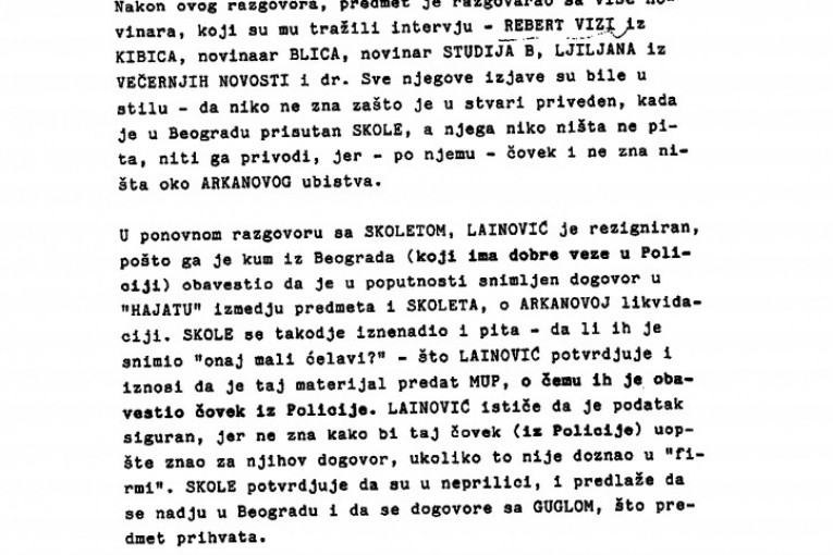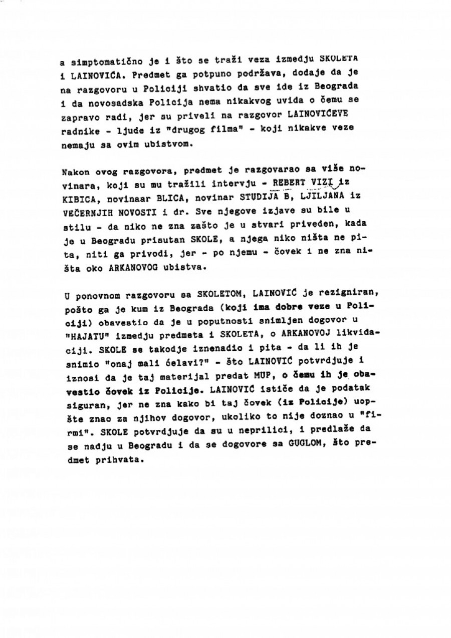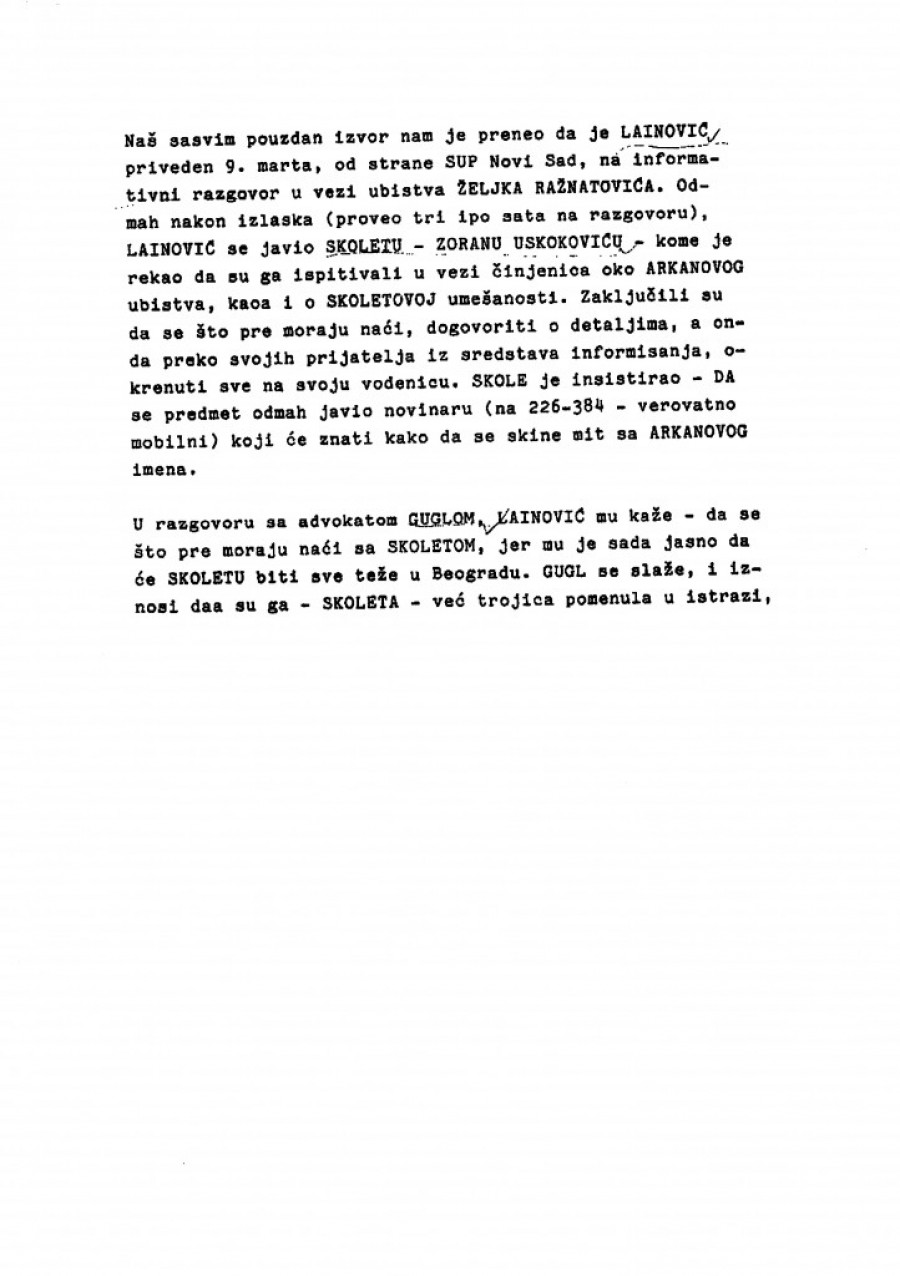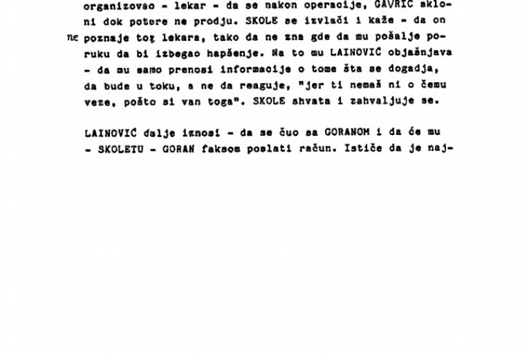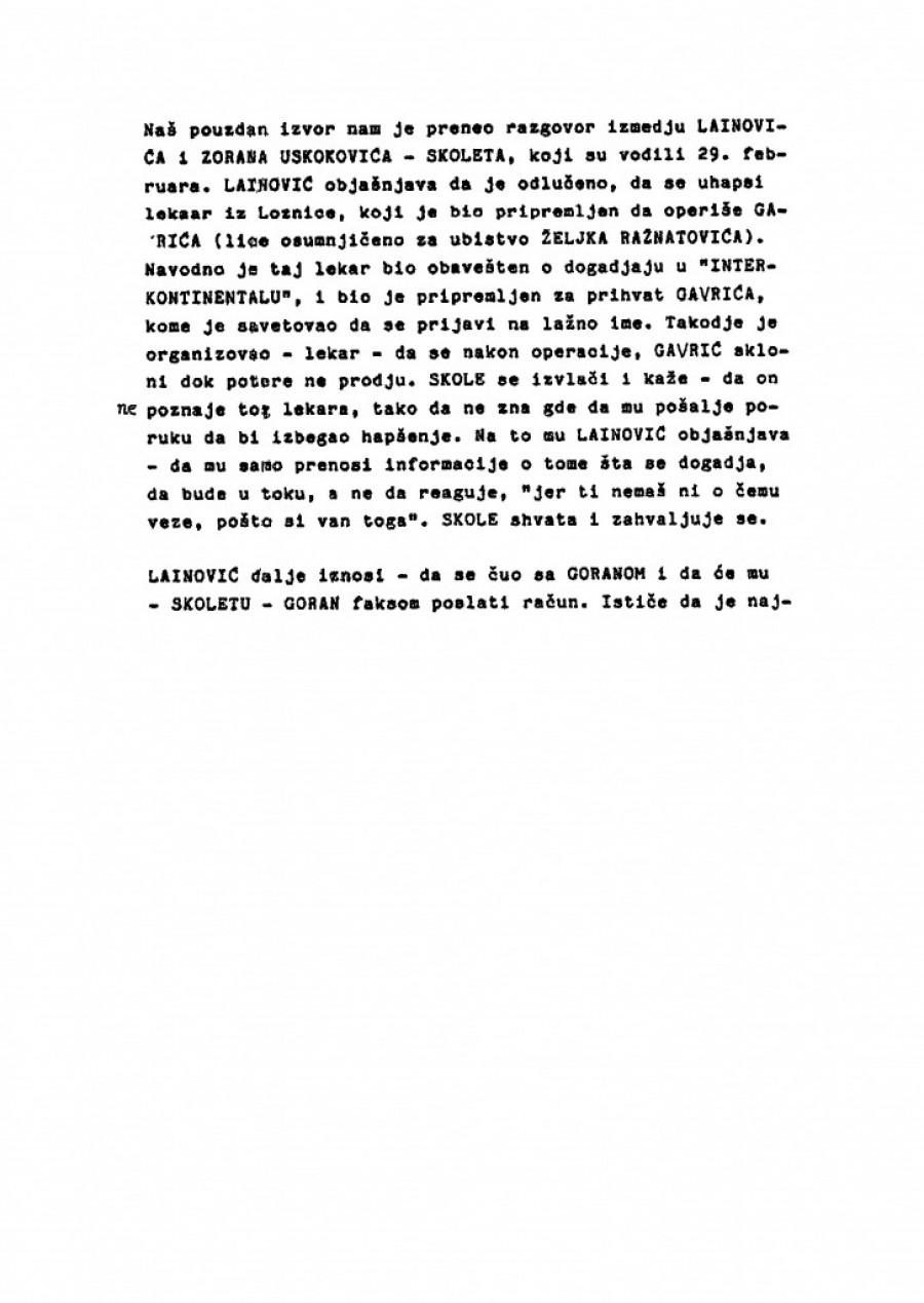 Naš pouzdan izvor nam je preneo razgovor između Lainovića i Zorana Uskokovića, koji su vodili 29. februara (mesec i po nakon Arkanovog ubistva - prim. aut.). Lainović objašnjava da je odlučeno da se uhapsi lekar iz Loznice koji je bio pripremljen da operiše Gavrića (lice osumnjičeno za ubistvo Ražnatovića). Navodno je taj lekar bio obavešten o događaju u "Interkontinentalu" i bio je pripremljen za prihvat Gavrića, kome je savetovano da se prijavi na lažno ime.