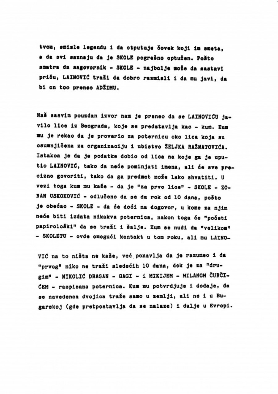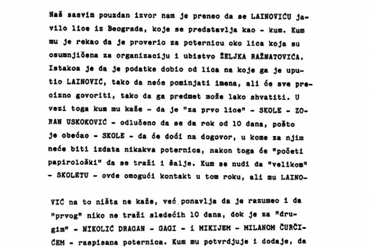 Naš sasvim pouzdan izvor nam je preneo da se Lainoviću javilo lice iz Beograda koje se predstavlja kao Kum. Kum mu je rekao da je proverio za poternicu oko lica koja su osumnjičena za organizaciju i ubistvo Željka Ražnatovića. Istakao je da je podatke dobio od lica na koje ga je uputio Lainović, tako da neće pominjati imena, ali će sve precizno govoriti, tako da ga predmet može lako shvatiti.