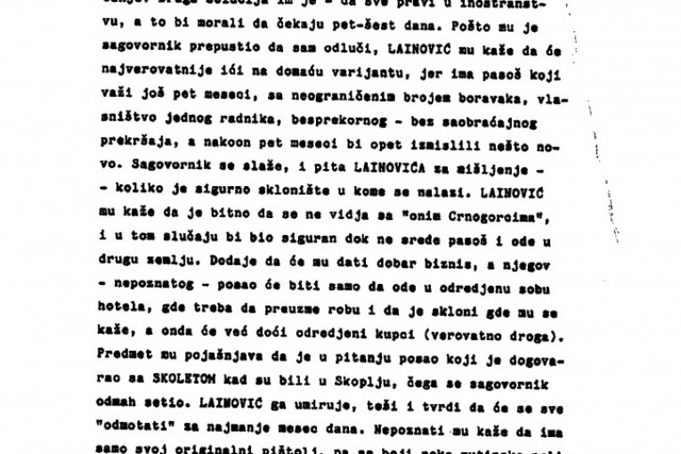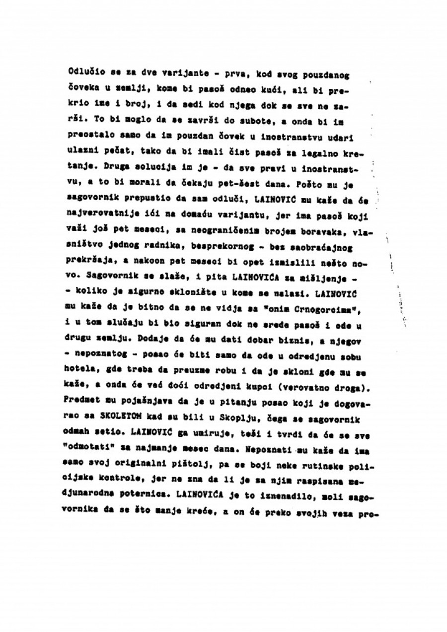 Odlučio se za dve varijante. Prva, kod svog pouzdanog čoveka u zemlji, kojem bi pasoš odneo kući, ali bi prekrio ime i broj, i da sedi kod njega dok se sve ne završi (izveštaj je o tome kako Dugi Lainović pokušava da napravi lažna dokumenta Arkanovim ubicama - op. aut.). To bi moglo da se završi do subote, a onda bi preostalo samo da im pouzdan čovek u inostranstvu udari ulazni pečat, tako da bi imali čist pasoš za legalno kretanje. Druga solucija im je da sve pravi u inostranstvu, a to bi morali da čekaju pet-šest dana.