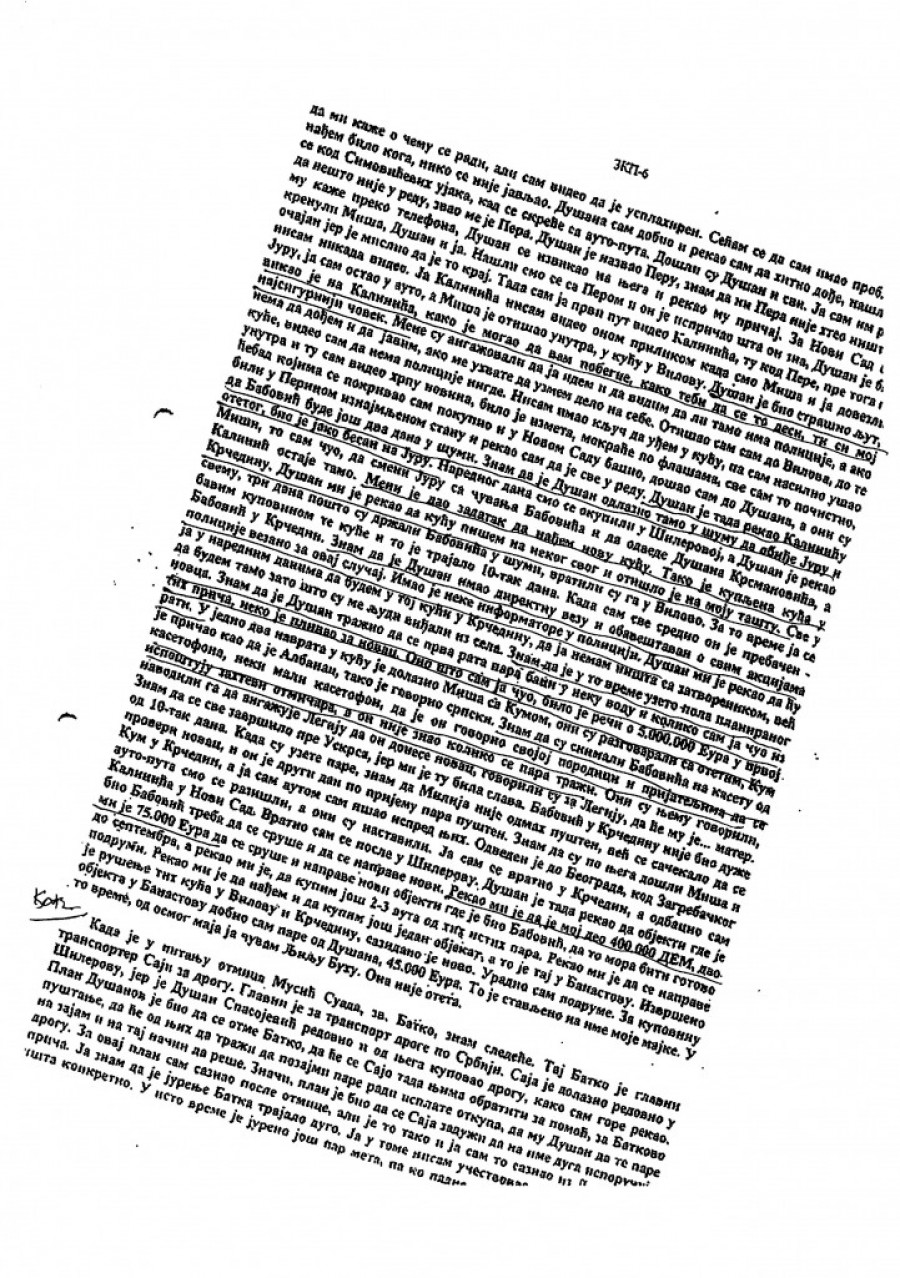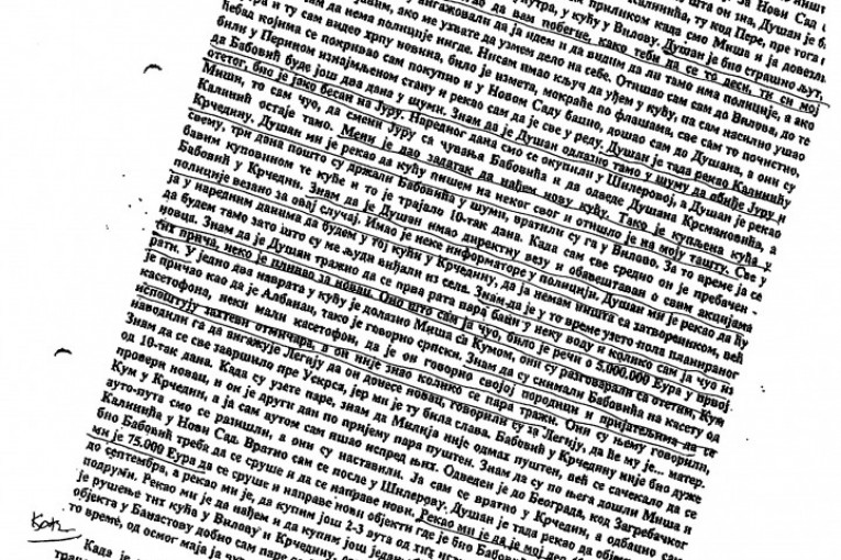 Znam da je u to vreme uzeto pola planiranog novca. Znam da je Dušan tražio da prva rata para bude bačena u neku vodu i, koliko sam čuo, neko je plivao za novac. Ono što sam ja čuo bilo je 5.000.000 evra u prvoj rati.