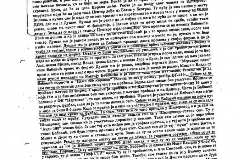 Znam da su snimali Babovića na kasetu kasetofona, neki mali kasetofon, da je on govorio svojoj porodici i prijateljima da se ispoštuju zahtevi, a on nije znao koliko se para traži.