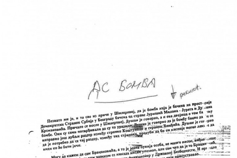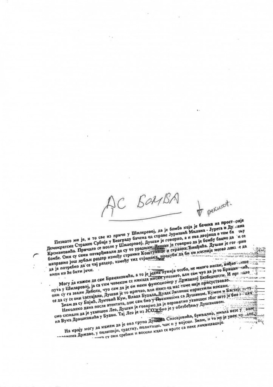 Poznato mi je, i to sve iz priče u Šilerovoj, da je bomba koja je bačena na prostorije Demokratske stranke Srbije u Beogradu bačena od strane Jurišić Milana Jureta i Dušana Krsmanovića. Pričalo se posle u Šilerovoj, Dušan je govorio, a i ova dvojica o tom bacanju bombe. Oni su sami potvrđivali da su to uradili, Dušan je govorio da je bombu bacio da bi se napravio još dublji razdor između stranke Koštunice i stranke Đinđića. Dušan je govorio da je potrebno da se taj razdor između tih stranaka produbi da bi on kasnije mogao lakše da vidi ko će biti jači.