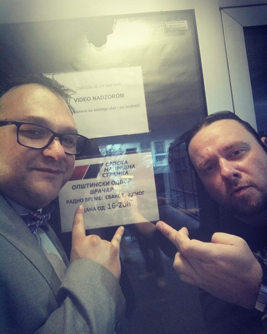 Foto: twitter.com/LosZaoOni su se slikali pored vrata Opštinskog odbora Napredne stranke, a Vidojković je pokazao srednji prst.
