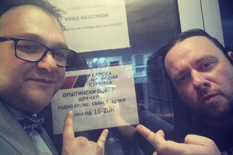Foto: twitter.com/LosZaoOni su se slikali pored vrata Opštinskog odbora Napredne stranke, a Vidojković je pokazao srednji prst.
