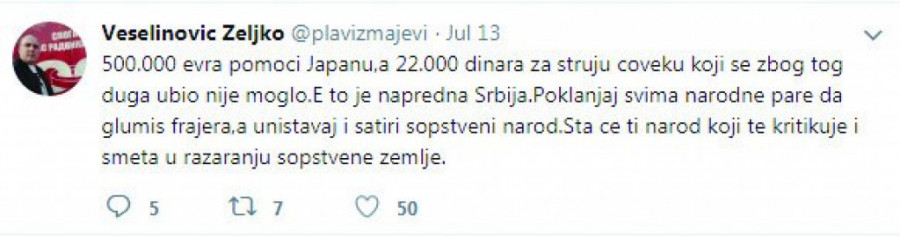 - 500.000 evra pomoći Japanu, a 22.000 dinara za struju čoveku koji se zbog tog duga ubio nije moglo. E, to je napredna Srbija. Poklanjaj svima narodne pare da glumiš frajera, a uništavaj i satiri sopstveni narod. Šta će ti narod koji te kritikuje i smeta u razaranju sopstvene zemlje - napisao je Veselinović na svom Tviter nalogu.