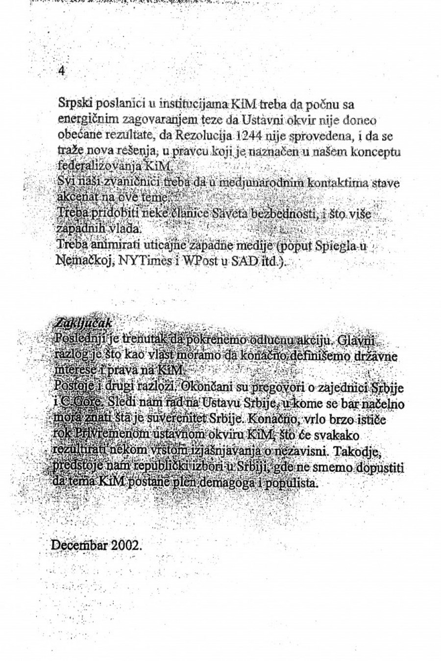 Zoran Đinđić je četiri meseca pre ubistva najbližim saradnicima predstavio dokument i njegovu strategiju za rešenje kosovskog pitanja. Upravo taj dokument, koji ima pet tačaka i koji do detalja navodi poteze koje Srbija treba da povuče kako bi povratila pokrajinu, po mišljenju nekih političara bio je razlog zbog kojeg je izvršen atentat na predsednika Vlade Srbije.