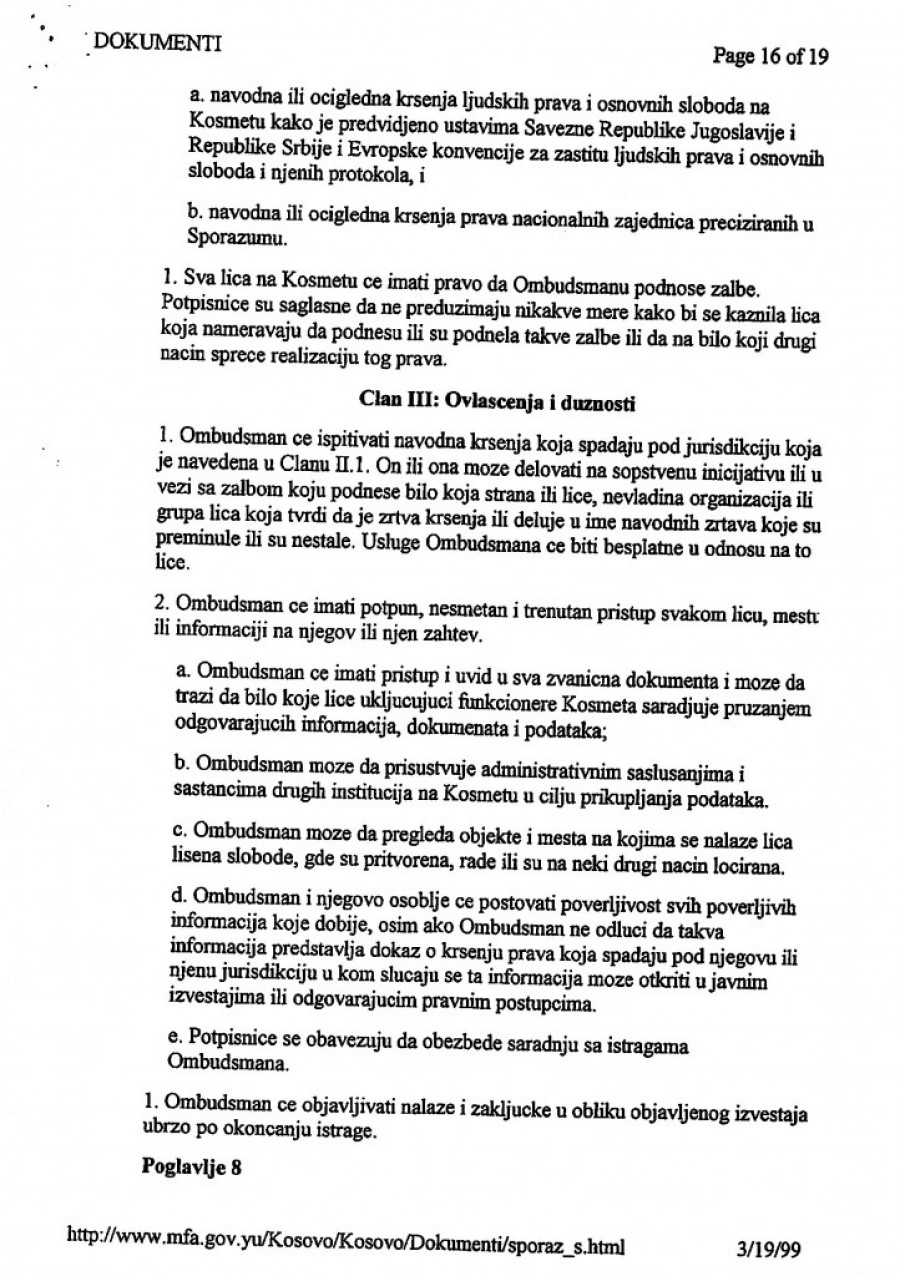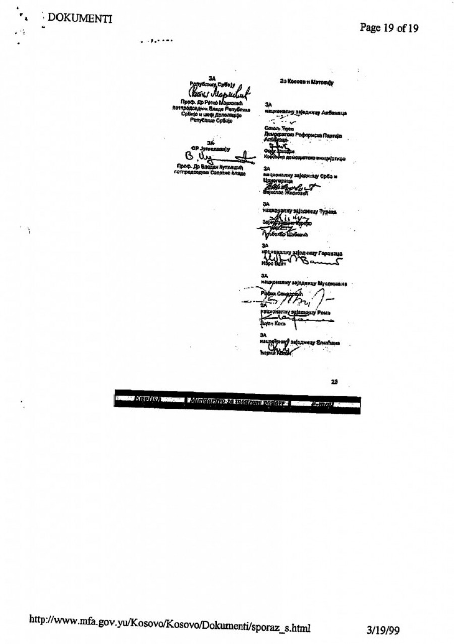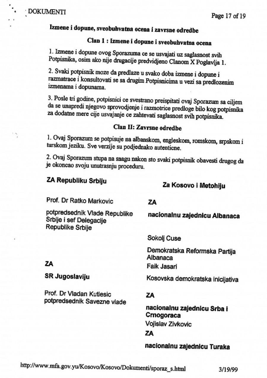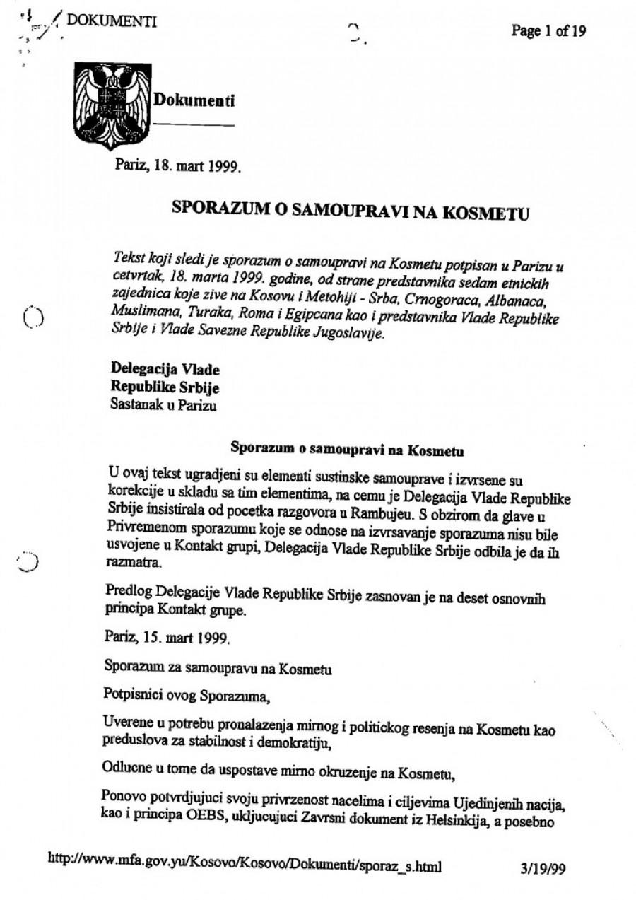 Srpski telegraf je ekskluzivno došao do dokumenta koji su 18. marta 1999. potpisali predstavnici Vlade Srbije i Vlade SRJ zajedno sa predstavnicima sedam etničkih zajednica koje žive na Kosovu i Metohiji. U pitanju je sporazum o samoupravi na Kosmetu koji je na Miloševićev nagovor sastavio tadašnji potpredsednik Vlade i šef pregovaračke delegacije Ratko Marković, predavši ga kao konačni predlog Srbije, ali on nikad nije uzet u razmatranje.