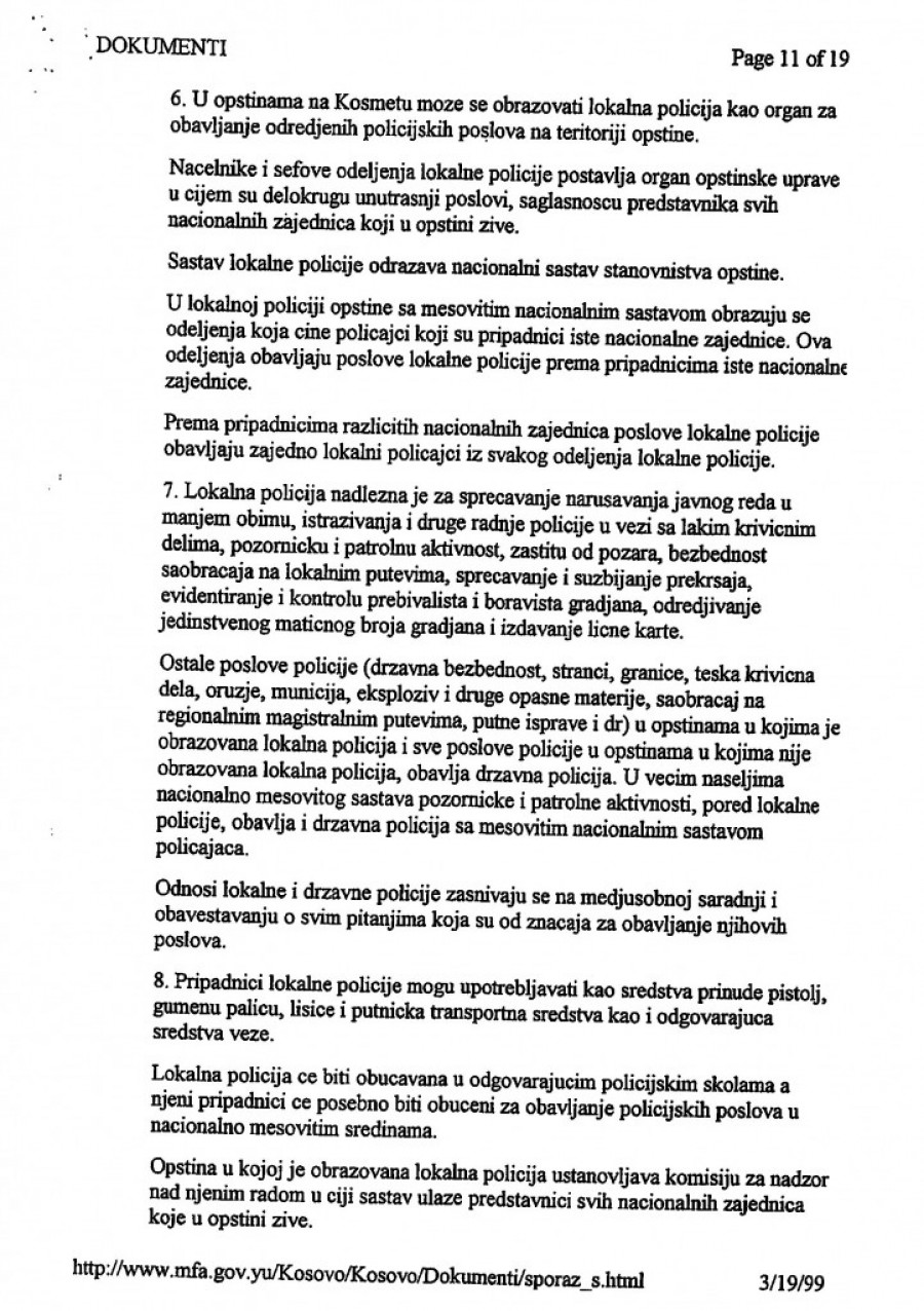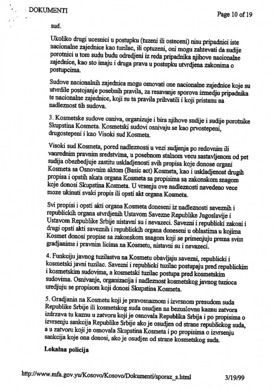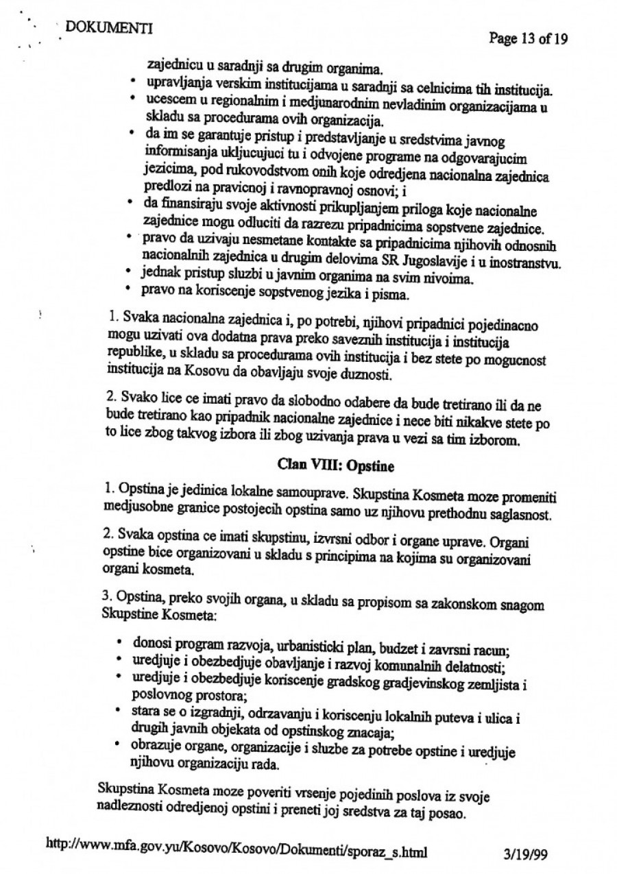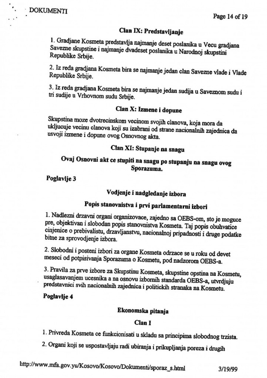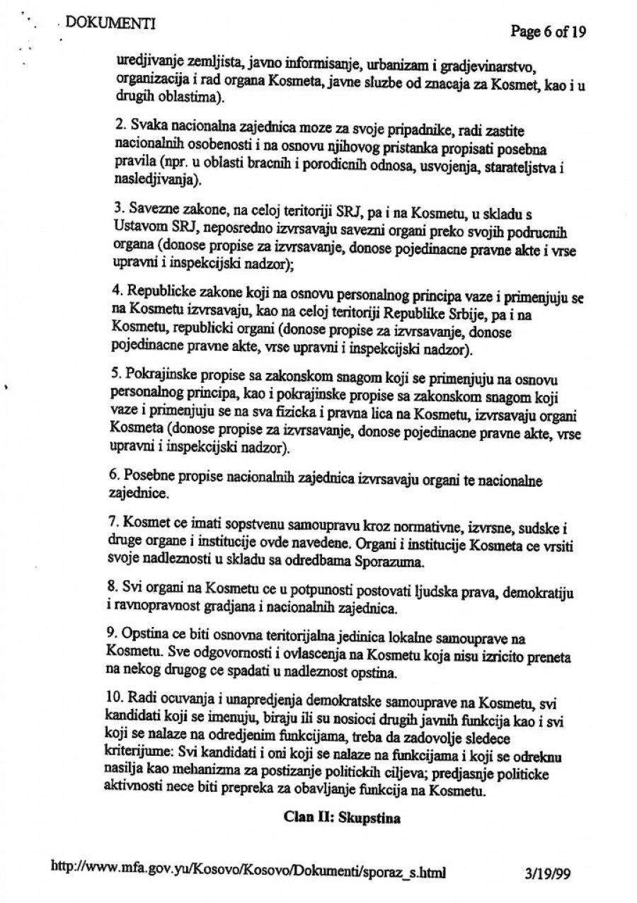 Osnovni akt ovog dokumenta ima 11 članova i u okviru njih, između ostalog, stoji da će se na KiM zavesti princip demokratske samouprave. Izvršnu vlast imao bi ministarski savet, dok je sudska funkcija bila namenjena sudovima Srbije, Kosmeta i nacionalnim zajednicama. Osim republičke, na teritoriji Kosmeta, prema ovom ugovoru, bila bi instalirana i lokalna policija. Građani Kosmeta bili bi predstavljeni sa najmanje 20 poslanika u Skupštini Srbije, a iz njihovih redova bili bi birani najmanje po jedan član savezne i republičke vlade.