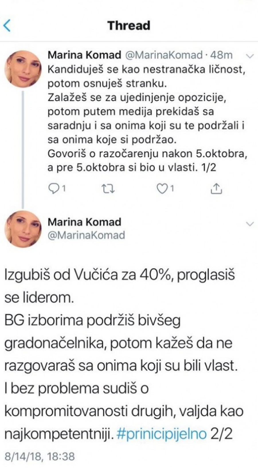 Tadićeva pr Marina Komad očitala je lekciju Saši Jankoviću i isprozivala ga na Tviteru...
