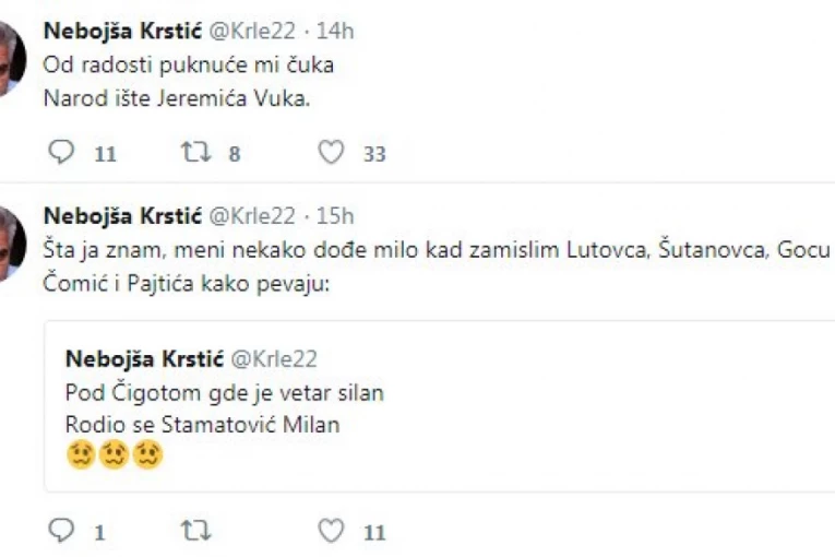 Foto: printscreen/twitter/nebojšakrstićNekadašnji član čuvenih Idola u poslednje vreme na svom Tviter nalogu sve se češće pratiocima obraća u stihovima. I to kakvim! Jedna od poslednjih njegovih poruka glasi: "Od radosti puknuće mi čuka, narod ište Jeremića Vuka". Malo pre toga, takođe je bio pesnički inspirisan, te je tvitnuo kako zamišlja Lutovca, Šutanovca, Gocu Čomić i Pajtića kako pevaju: "Pod Čigotom gde je vetar silan, rodio se Stamatović Milan". Ali, ni tu nije kraj. Na Krstićevom Tviter nalogu osvanuo je i tvit: "Oj Milane, jabuko sa grane, nad Srbijom komandu preuzmi, za Rusiju majku se zauzmi", kao i: "Takav čovek ne rađa se više, Milan Stamat istoriju piše".