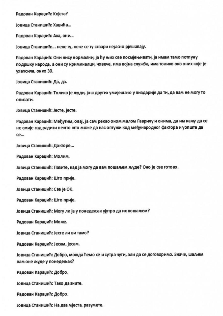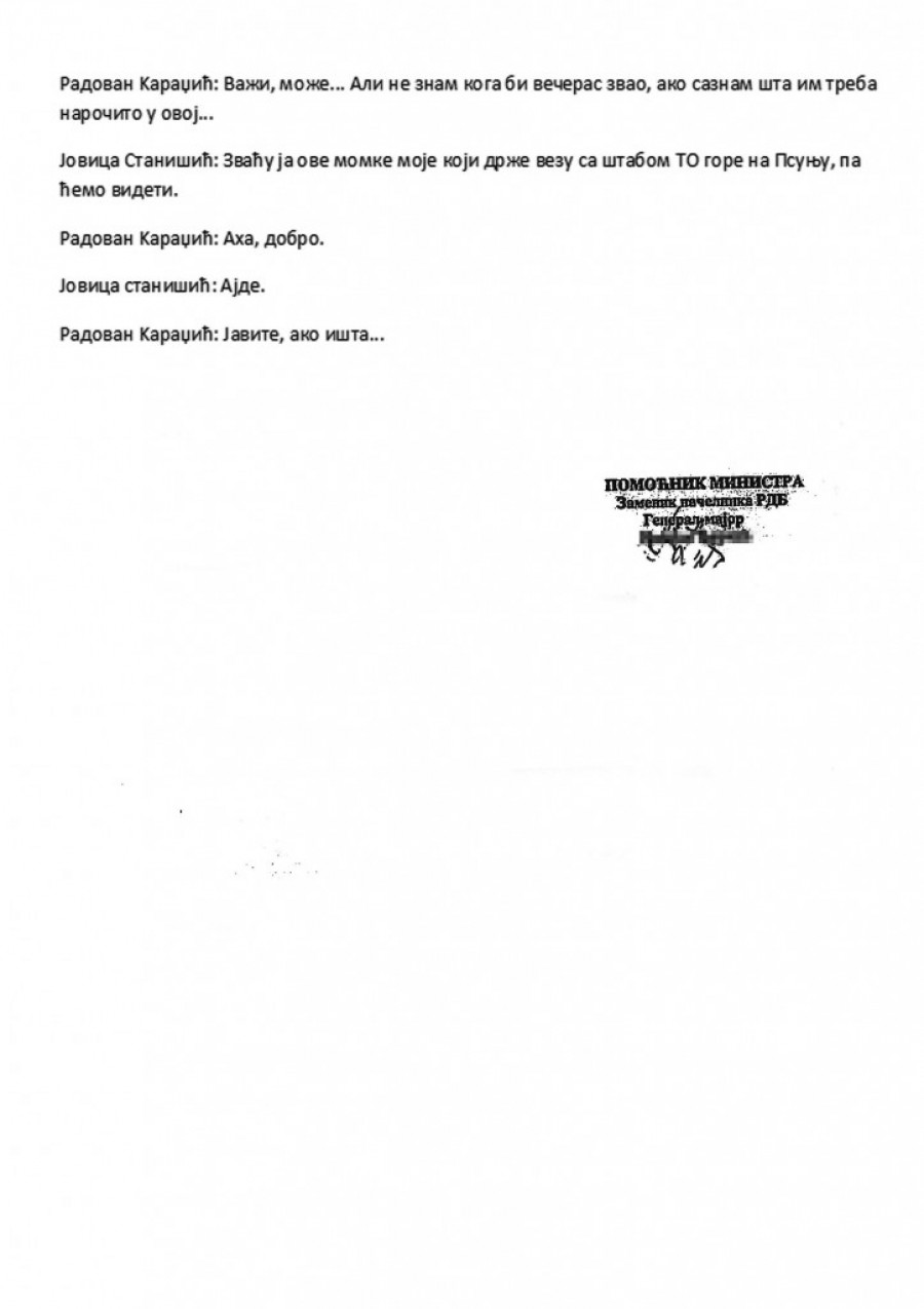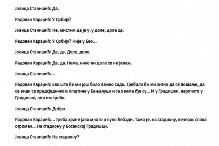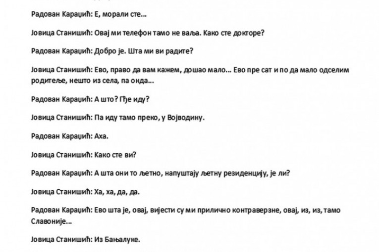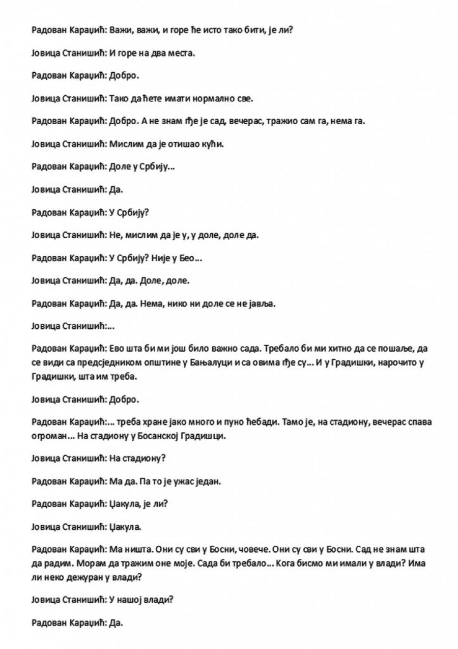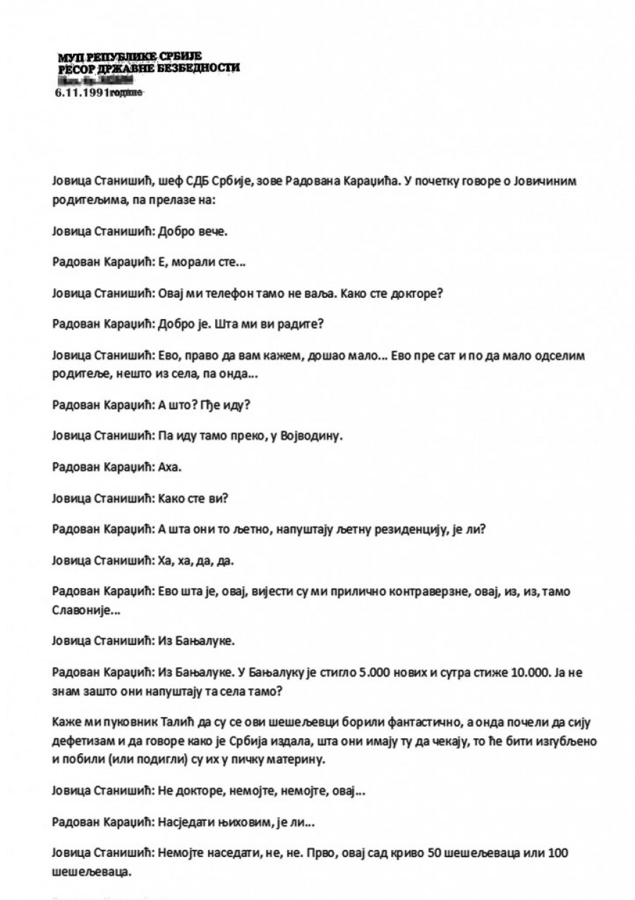 Služba bezbednosti presrela je nekoliko razgovora koje su vodili Stanišić i Karadžić, a koji su zavedeni pod brojem tr. 9776 012-097.