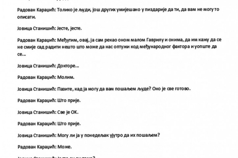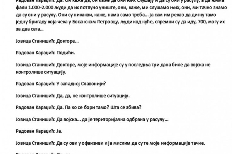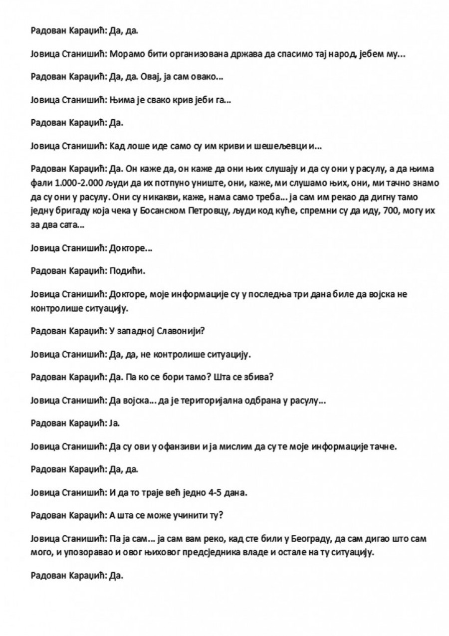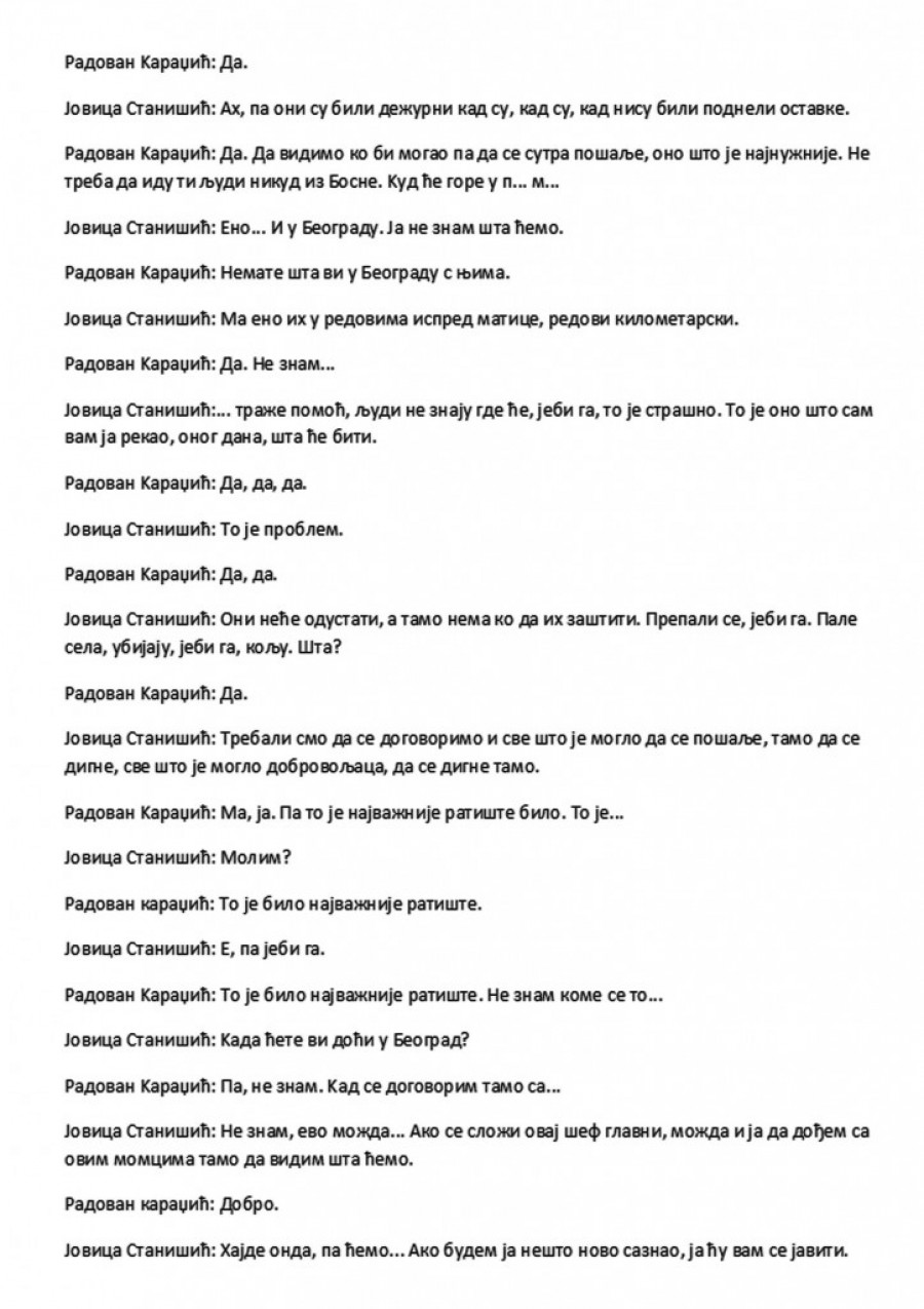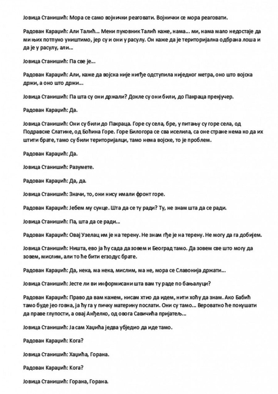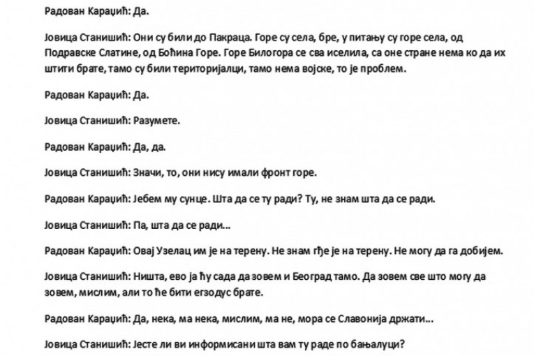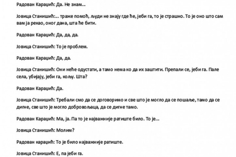 STANIŠIĆ: Jeste li vi informisani šta vam tu rade po Banjaluci? KARADŽIĆ: Pravo da vam kažem, nisam htio da idem niti hoću da znam. Ako (Milan) Babić tamo bude jeo govna, ja ću ga u pičku materinu poslati. Oni su tamo... Verovatno će pokušati da prave gluposti, a ovaj Anđelko, od ovoga Savičića prijatelj... STANIŠIĆ: Ja sam Hadžića jedva ubjedio da ide tamo. KARADŽIĆ: Koga? STANIŠIĆ: Gorana, Gorana. KARADŽIĆ: Aha, oni... STANIŠIĆ: ...Neke tu, neke se tu stvari nejasno rješavaju. KARADŽIĆ: Toliko je ljudi još drugih umiješano u pizdarije da ti, da vam, ne mogu to opisati. |
