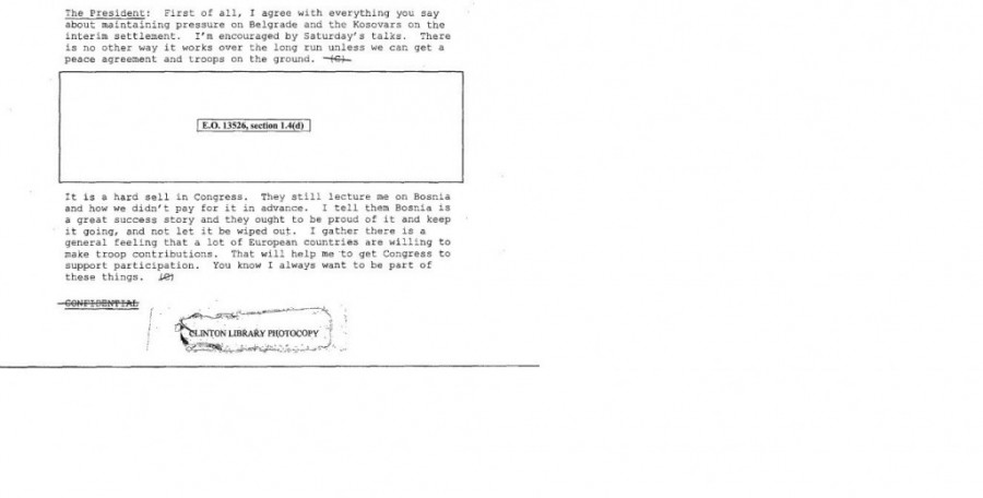 - Potpuno se slažem sa tobom u vezi sa svim. Očigledno moramo da uradimo nešto i budemo spremni da sprovedemo akciju. Pokušaću da ubedim Kongres da to podrži. Problem mi je jedino ideja ulaska trupa na Kosovo jer mi u vezi s tim pitanjem treba neka vrsta sporazuma. Zaista moramo da uradimo nešto jer bi vojna akcija bez političkog plana bila problematična. Ovo bi trebalo da bude stvar koju ćemo dovesti do kraja. U drugačijoj smo situaciji nego sa Bosnom jer je većina sveta za ljude na Kosovu rekla da oni zaslužuju veću autonomiju, ali ne i nezavisnost - priznao je tada Klinton svom prijatelju, čime je ujedno i pokazao da Amerika nije birala sredstva da besramnom kampanjom i silom dovede do toga da mnogi prihvate jednostrano proglašenje nezavisnosti Kosova.