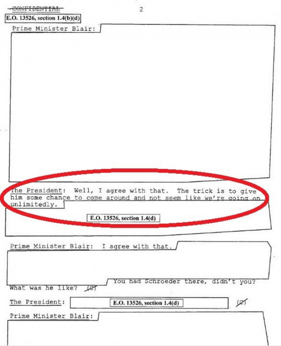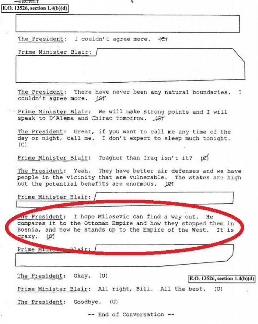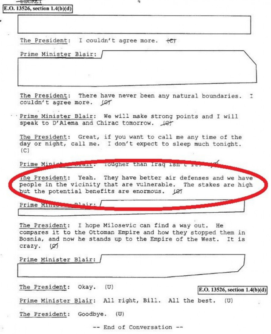 Ostatak izjave britanskog šefa vlade ostao je skriven jer SAD imaju obavezu da posle nekog vremena skinu oznaku poverljivosti samo sa onoga što je rekao njihov lider, ali ne i sa ostalih. Međutim, veruje se da u nastavku on govori o Miloševiću, zbog čega se Klinton nadovezuje najžešćim pretnjama.