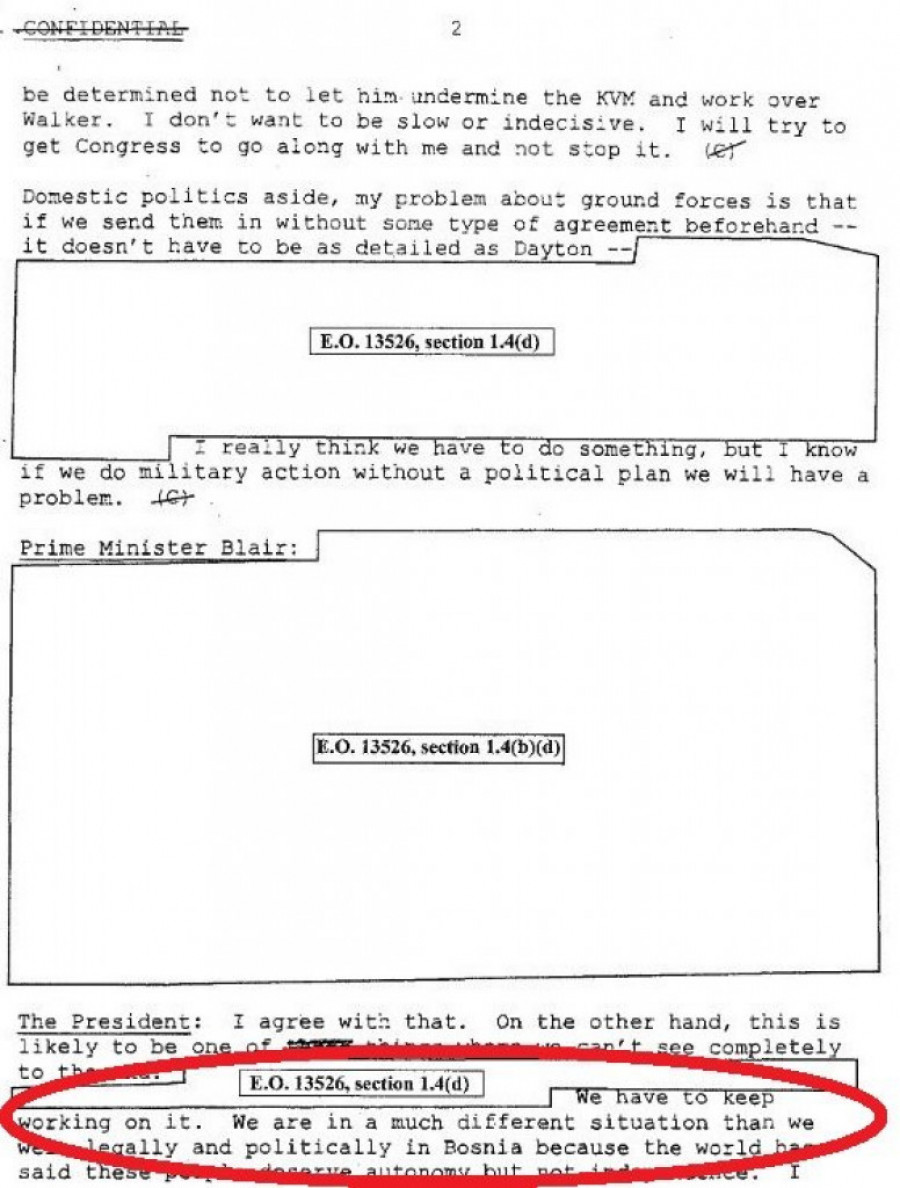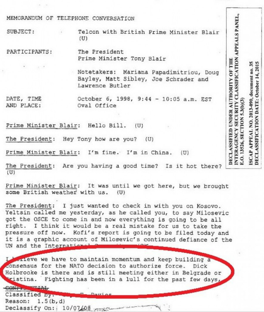 - Zdravo, Bile. Šta ćemo sa Kosovom? - započinje Bler jedan od razgovora s Klintonom, koji se dogodio 21. januara 1999, ali čiji se delovi, uprkos tome što je s njih već neko vreme skinuta oznaka državna tajna, ipak i dalje kriju.