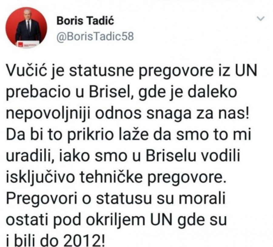 - Vučić je statusne pregovore iz UN prebacio u Brisel, gde je daleko nepovoljniji odnos snaga za nas. Da bi to prikrio laže da smo to mi uradili, iako smo u Briselu vodili isključivo tehničke pregovore. Pregovori o statusu su morali ostati pod okriljem UN gde su bili do 2012. godine - istakao je Tadić.