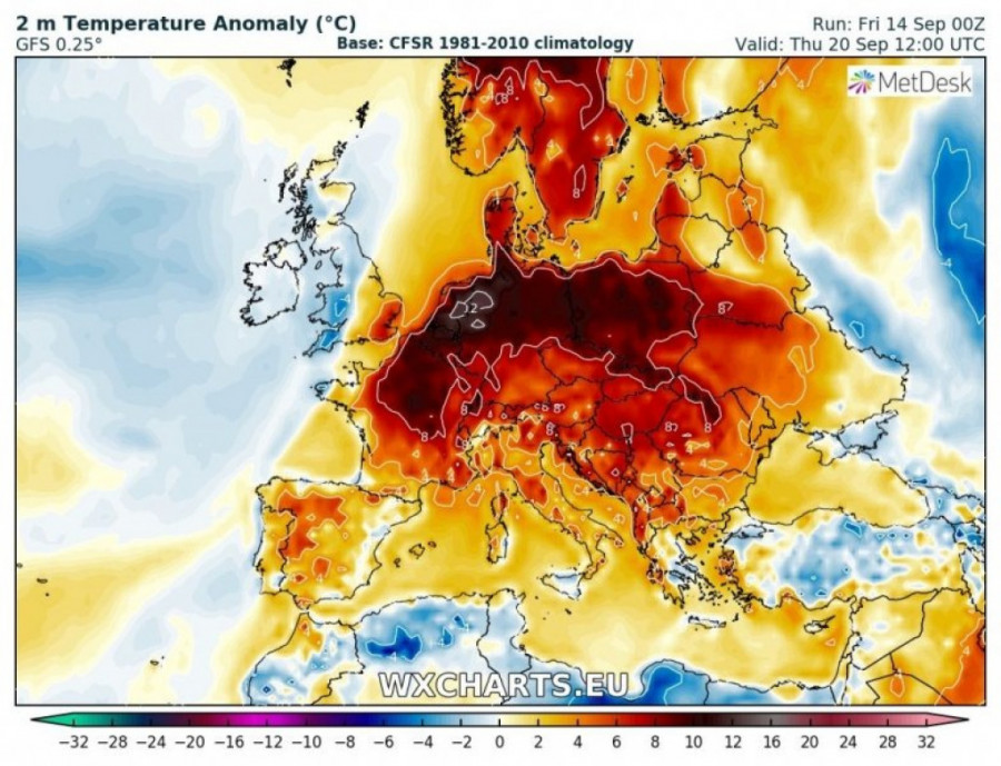 Prema Severe Weather Europe, toplotni talas zahvatiće ceo kontinent, temperatura će biti osam do 10 stepeni viša nego prosečna do kraja septembra u centralnoj, zapadnoj, istočnoj i jugoistočnoj Evropi.