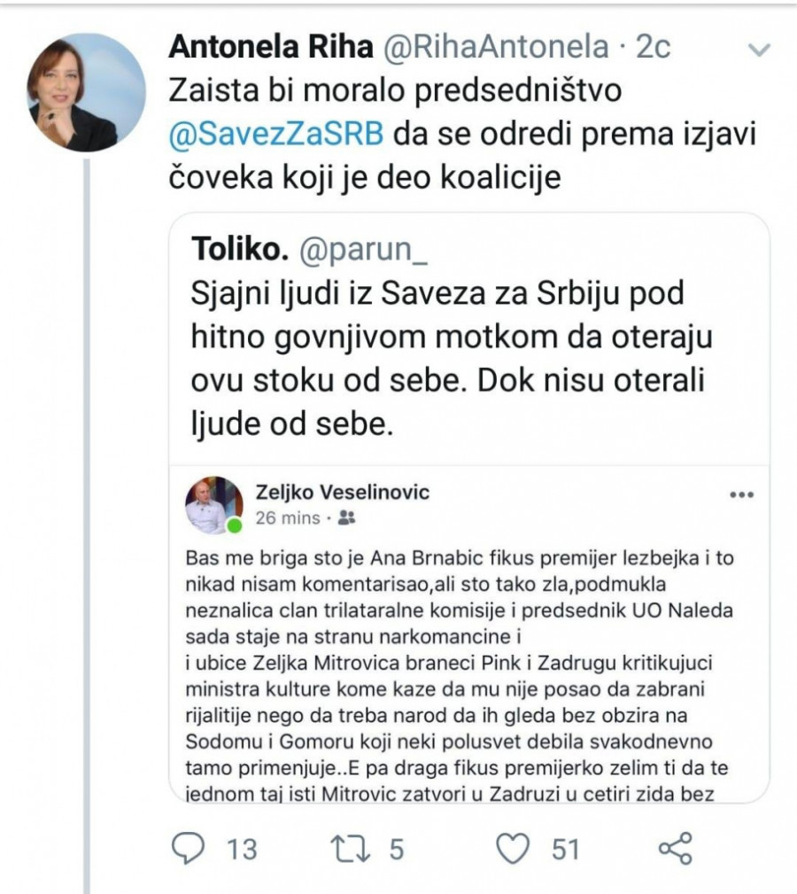 Foto: Promo foto- Baš me briga što je Ana Brnabić fikus premijer lezbijka i to nikad nisam komentarisao, ali što tako zla, podmukla neznalica, član trilateralne komisije i predsednik UO Naleda sada staje na stranu narkomančine i ubice Željka Mitrovića braneći Pink i Zadrugu kritikujući ministra kulture kome kaže da mu nije posao da zabrani rijalitije. E pa, draga fikus premijerko, želim ti da te taj isti Mitrović zatvori u Zadruzi u četiri zida - napisao je Veselinović na Fejsbuku, a novinarka Antonela Riha je to osudila.