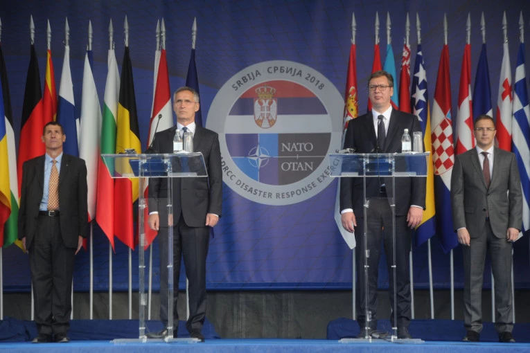 Predsednik Srbije Aleksandar Vučić i generalni sekretar NATO Jens Stoltenberg prisustvovali su otvaranju terenske vežbe u Mladenovcu "Srbija 2018".