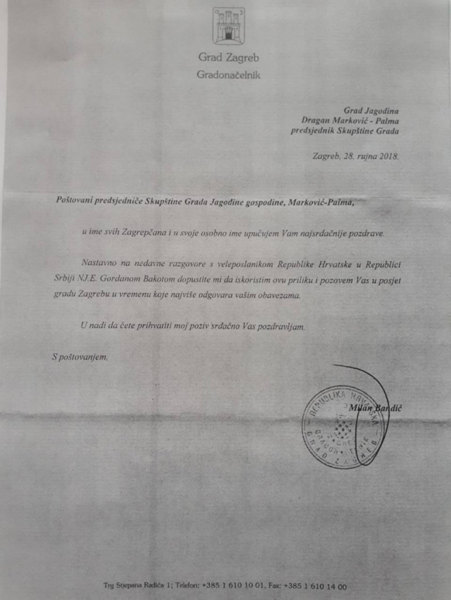 Dragan Marković Palma, narodni poslanik i predsednik Skupštine Grada Jagodina, na poziv gradonačelnika Zagreba Milana Bandića odlazi u zvaničnu posetu u glavni grad Hrvatske, Zagreb, u petak.