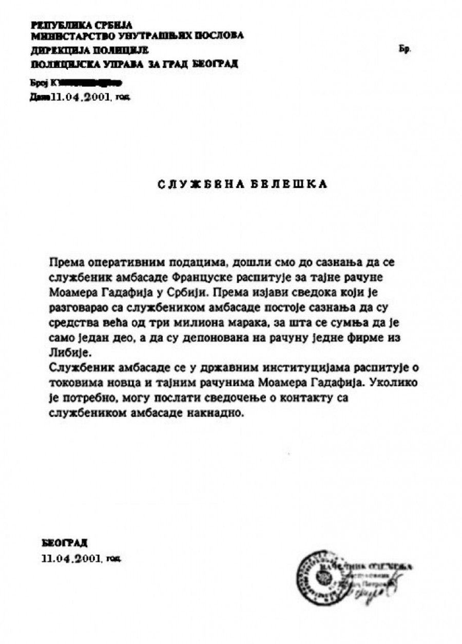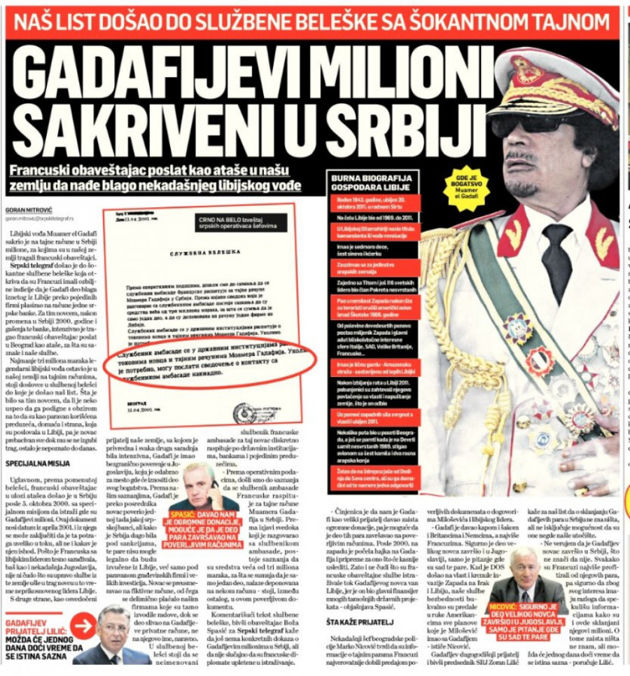 Foto: www.profimedia.rsPrema službenoj belešci, Francuzi su imali ozbiljne indicije da je Gadafi deo blaga iznetog iz Libije preko pojedinih firmi plasirao na račune jedne srpske banke. Za tim novcem, nakon promena u Srbiji 2000. godine i gašenja te banke, intenzivno je tragao francuski obaveštajac poslat u Beograd kao ataše, za šta su saznale i naše službe.