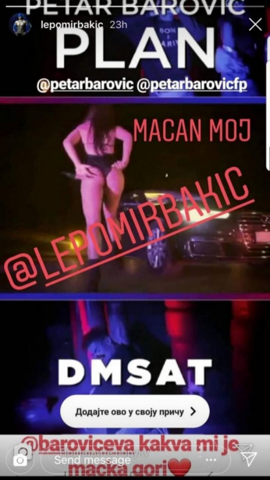 Foto: instagram.com/lepomir bakićNaime, ovaj bivši policajac, koji je svojevremeno dobio otkaz zbog ulaska u rijaliti, oglasio se na svom instagram nalogu, valjda da pohvali novu pesmu mladog pevača Petra Barovića "Plan", pa uz fotografiju gole i debele ženske guzice, napisao "MACAN MOJ" i dodao svoje ime. Možda mu je tepao, a možda je smisao poruke i drugačiji.