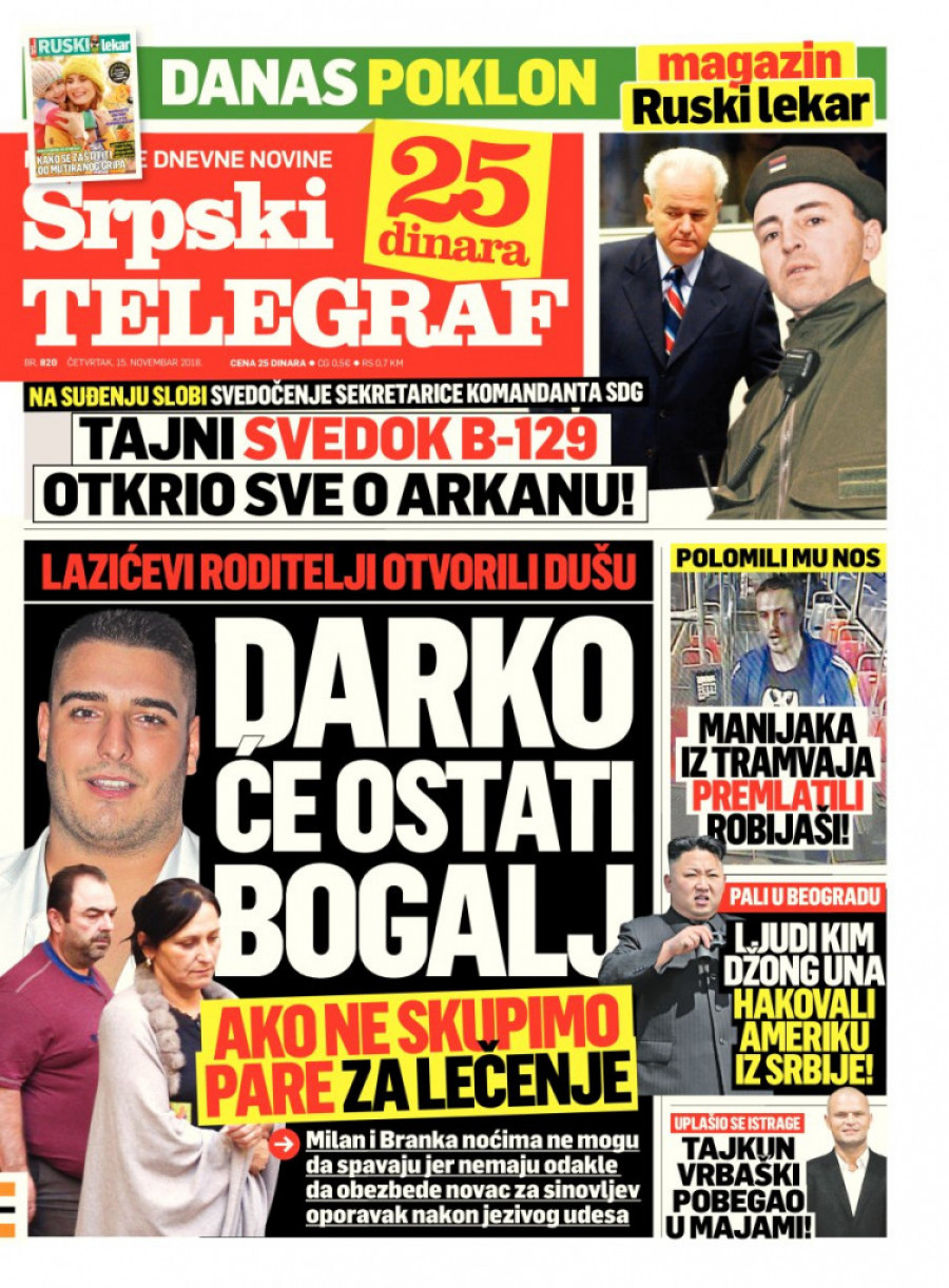 O svemu ovome, ali i tome kakve že poisledice po zdravlje snositi pevač Darko Lazić, ko je premlatio manijaka iz tramvaja i gde je tajkun Vrbaški, čitajte u sutrašnjem izdanju "Srpskog telegrafa".