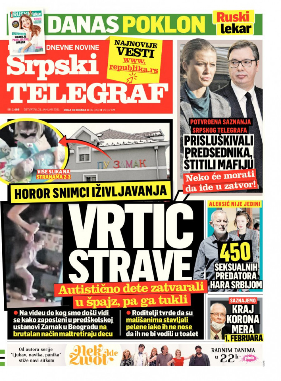 Užasne scene iz Zvečanske o kojima je brujala cela Srbija deluju kao zabavni film u odnosu na snimke iz vrtića "Zamak" u beogradskom naselju Voždovac, u čiji posed je došao Srpski telegraf. Na njima se vidi kako vaspitačica drži dete na podu i grubo ga s obe ruke diže u vazduh, na silu mu gura cuclu u usta, izvlači decu iz špajza u kom su zatvorena, viče na njih dok ona jecaju i još mnogo toga.
