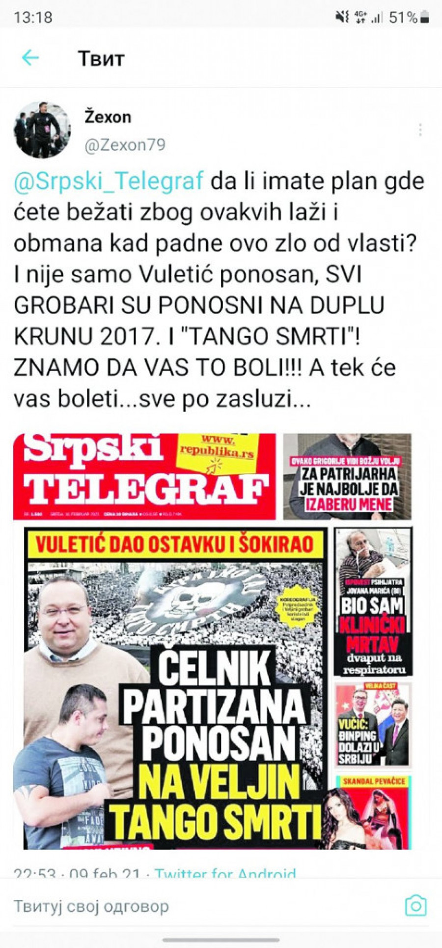 Pretnje grobara Srpskom telegrafu: Svi smo ponosni na "tango smrti"!Navijači Partizana uputili su preko Tvitera ozbiljne pretnje redakciji Srpskog telegrafa zbog toga što je naš list osudio sramnu poruku sada već bivšeg potpredsednika ovog kluba Vladimira Vuletića, koji je uz objavu o ostavci na funkciju napisao i da je ponosan na "tango smrti" Velje Nevolje. - Da li imate plan gde ćete bežati zbog ovakvih laži i obmana kad padne ovo zlo od vlasti. I nije samo Vuletić ponosan, SVI GROBARI SU PONOSNI NA DUPLU KRUNU 2017. I "TANGO SMRTI"! ZNAMO DA VAS TO BOLI!!! A tek će vas boleti... sve po zasluzi - stoji u tvitu korisnika pod pseudonimom Zekson79. Podsetimo, Vuletić je ostavku podneo pošto je otkriveno da je mafijaška grupa Veljka Belivuka imala svoj štek na stadionu u Humskoj, da je Belivuk imao status zaposlenog u Partizanu i dobijao 5.000 evra mesečno, a da je sedište svojih firmi imao upravo na adresi Humska 1. Poznat i ranije po čudnim i problematičnim stavovima, Vuletić je ostavio poruku koja ima vrlo zloslutno značenje.