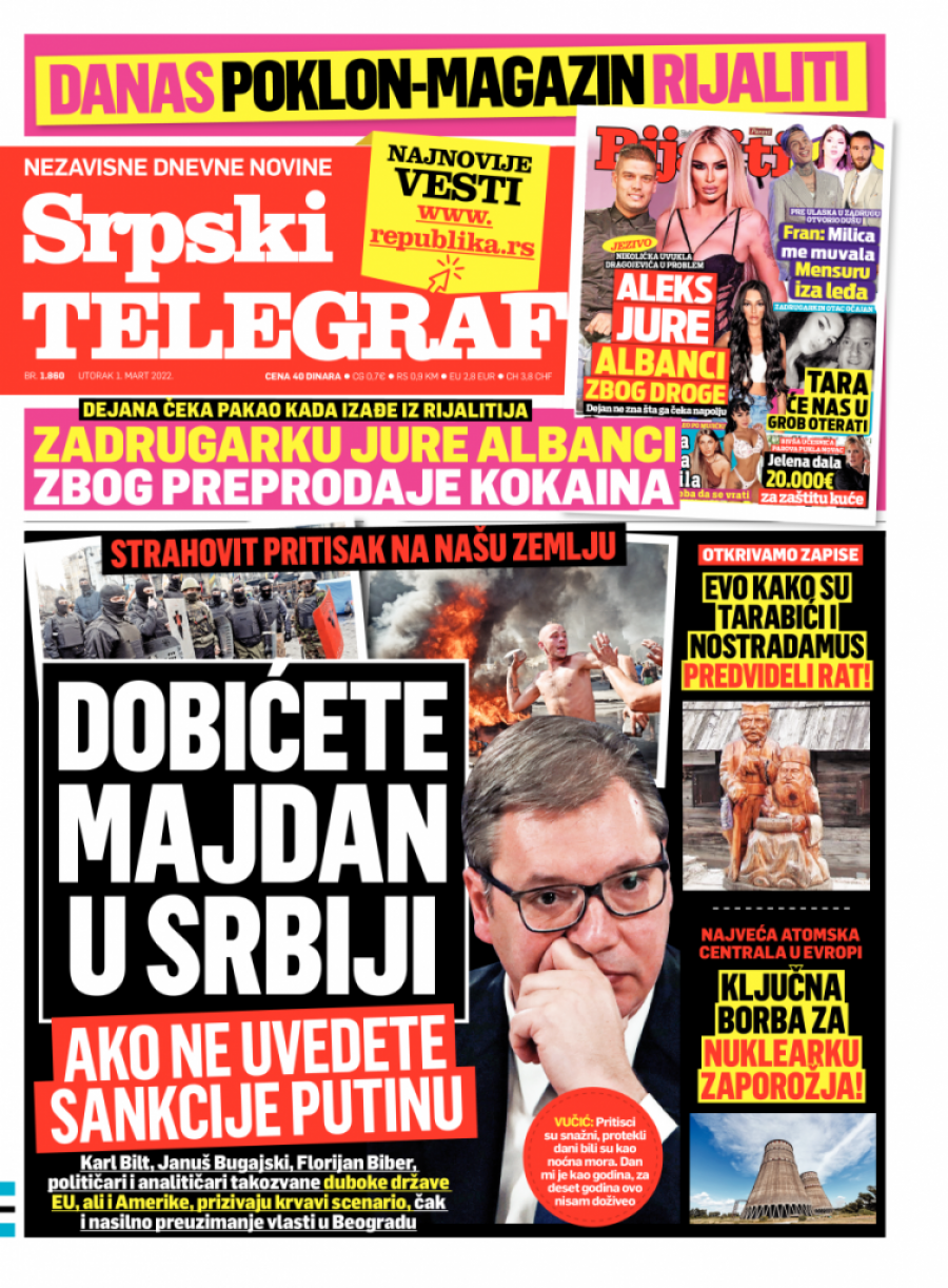 STRAHOVIT PRITISAK NA NAŠU ZEMLJU: Dobićete Majdan u Srbiji, ako ne uvedete sankcije Putinu Autor: T. Kovačević - T. Bujišić Svet 28.02.2022 20:00 Pratite nas i putem Android ili iOS aplikacija Političari i analitičari takozvane duboke države EU, ali i Amerike, prizivaju krvavi scenario i nasilno preuzimanje vlasti u Beogradu. Foto: Tanjug Ukrajinska kriza ujedinila je mrzitelje Srbije, koji otvoreno prete našoj zemlji. Paleta pritisaka je široka i ide dotle da prizivaju krvavi scenario i najavljuju da će u Srbiji nasilno smeniti vlast, izazivajući novu revoluciju poput one u ukrajinskom Majdanu, koja je bila uvertira za rat koji sada vode Kijev i Moskva. Na čelo kolone stali su poznati mrzitelji Karl Bilt, Januš Bugajski, Florijan Biber, Danijel Server, političari i analitičari takozvane duboke države Evropske unije, ali i Amerike. Od Beograda i naše države zahtevaju da bez zadrške stane uz njih, da vodi politiku koju oni zagovaraju i momentalno uvede sankcije Rusiji i njenom predsedniku Vladimiru Putinu. Da nisu u pitanju prazne priče, ukazao je i predsednik Srbije Aleksandar Vučić, koji je juče rekao da su pritisci snažni, da su protekli dani bili kao noćna mora, te da su mu prethodnih nekoliko dana najteži u karijeri. ŽELJNI SUKOBA Stav Beograda da poštuje teritorijalni integritet Ukrajine, ali da neće uvoditi sankcije Rusiji, koji su pohvalili i Amerika i Rusija, nisu zadovolji mrziteljsku četvorku. Komentarišući poteze Beograda, švedski političar i diplomata Karl Bilt otvoreno je pozvao na diskvalifikovanje Srbije. - Ovim stavom Srbija se, de fakto, diskvalifikovala iz procesa pristupanja EU. Ne bi trebalo biti mesta za nove članove Unije koji ne dele naše osnovne vrednosti i interese - napisao je Bilt na Tviteru, u odgovoru na tvit nemačkog novinara i pisca Mihaela Martensa. Prekid evrointegracija zahtevao je i Florijan Biber: - Ako srpska vlada ne osudi rusku agresiju, jedina zemlja, osim samih agresora, treba da stavi tačku na sve pregovore o pristupanju EU. Ne može biti pristupanja za državu koju vodi vlada koja se toliko temeljno razlikuje od vrednosti EU. Foto: Tanjug/AP Nikolaj Petrušev Obaveštajni rat protiv Srbije Bugajski je u konstrukcijama otišao toliko daleko da se bavio posledicama otkazane posete ruskog zvaničnika Beogradu. Dolazak Nikolaja Patruševa, glavnog obaveštajca ruskog predsednika Vladimira Putina, u Beograd otkazan je, a prema rečima Suzane Vasiljević, savetnice predsednika Srbije u toku je obaveštajni rat protiv Srbije. Ipak, činjenica da Petrušev neće stići u Beograd nije sprečila Bugajskog da komentariše šta bi se desilo da je došlo do posete: - Da je došao, Nikolaj Patrušev bi pokušao da uvuče Srbiju u novi rat na Balkanu: da podeli Bosnu i Hercegovinu, zbaci vlast u Crnoj Gori i organizuje provokacije protiv Kosova. Ni Danijel Server, američki stručnjak za Balkan i zagovornik klintonovske politike, nije propustio priliku da ukrajinsku krizu iskoristi za napad na Srbiju i iznese tvrdnje da će to Srbija iskoristi da uz pomoć Rusije drži sever Kosova pod svojom kontrolom. Najdalje je otišao Januš Bugajski, viši saradnik Fondacije Džejmstaun iz Vašingtona i stručnjak za Balkan, koji je u intervjuu za Danas najavio krvavu revoluciju: - Nema više izgovora za "balansiranje saveza". Svaka podrška Kremlju, bilo kroz ćutanje ili aktivnu diplomatsku pomoć, biće posmatrana kao saradnja. Tokom Drugog svetskog rata Srbija i Jugoslavija su bile podeljene od režima koji su sarađivali sa nacističkom Nemačkom da bi osvojili teritoriju. Srbija bi sada postala njihov ekvivalent ako je Putin gura da traži "veliku Srbiju" na Balkanu. Ili će Vučić pokazati posvećenost Zapadu ili će Srbiji biti potrebna sopstvena majdanska revolucija da zbaci kolaboracionistički režim i uči od hrabrog ukrajinskog naroda. DAN KAO GODINA Komentarišući Biltov zahtev da diskvalifikuje Srbiju iz priče o učlanjenju u EU, Vučić je rekao da je u toku neka kampanja za koju nije imao ni minut da je prati, a kamoli učestvuje u njoj. - Ja to nisam u ovih 10 godina nikada doživeo. Čak ni u Briselu 2013. nije bilo tako teško kao sada - naveo je šef države. Narandžasta revolucija * naziv za niz protesta i političkih događaja u Ukrajini iz 2004. i 2005. * pokrenule su ga pristalice Viktora Juščenka, koji je smatrao da je pobeda Viktora Janukoviča (tadašnjeg premijera Ukrajine) posledica izborne prevare * protesti su započeli u zapadnom i centralnom delu Ukrajine, a Trg nezavisnosti u Kijevu Majdan okupio je oko pola miliona Juščenkovih pristalica * Vrhovni sud u Ukrajini je nakon pokrenutih protesta naredio ponavljanje izbora, na kojima je pobedio Juščenko * Juščenko je bio zagovornik ulaska Ukrajine u NATO, te se ova pobeda više smatrala pobedom EU i SAD, ili porazom Putina i Rusije, koji su podržavali Janukoviča Dodao je da što se tiče potrebe nekih ljudi da se iživljavaju nad Srbijom to mnogo više govori o njima. - Pošto nisu u stanju da to urade nekom ko je veći i snažniji od nas. To je kao kada imate muškarca na poslu koji nije u stanju da se izbori sa sopstvenom ambicijom i problemima i nekim od šefova kaže u lice, pa se kući iživljava nad decom. Tako je i ovde pošto nisu u stanju da se iživljavaju nad onima koji su jednako jaki, gledaju nad kim mogu. Čestitam Biltu, uspeo je u životu, neka nastave i on i drugi - poručio je predsednik. Ocenjujući da je situacija užasno teška, Vučić je rekao: - Dan mi je kao godina dug. Prethodna tri, četiri dana trajali su mi kao pola života. Ostario sam u prethodna tri dana, kao prethodnih deset godina. Mi imamo poziciju naše države i, koliko god i kako god mogli, čuvaćemo je. Nemamo mi drugu Šumadiju, od ove koju imamo, ili Vojvodinu, Timok, Moravu ni drugu Drinu. Foto: Tanjug/M. MILIVOJEVIĆ Vučić: Napadaju jer ne prihvataju uspeh Govoreći o napadima na našu zemlju koji dolaze iz regiona, Vučić je rekao da je to 