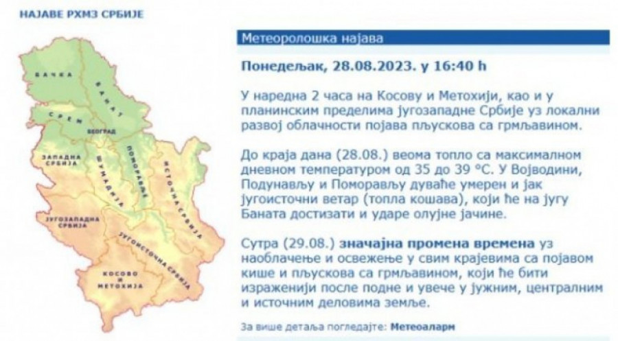 RHMZ IZDAO HITNO UPOZORENJE! U naredna dva sata stiže nam nevreme: Na udaru ovi delovi Srbije Autor: Republika Vesti 28.08.2023 20:27 Pratite nas i putem Android ili iOS aplikacija Od sutra u Srbiji osetno svežije sa nižim temperaturama Foto: Tanjug/Vladimir Šporčić, Pixabay.com Republički hidrometeorološki zavod izdao je novo upozorenje, prema kom nam u naredna dva sata stižu vremenske nepogode. Najpre će zahvatiti deo Kosova i Metohije, a potom planinske predelime jugozapadne Srbije gde se očekuju pljuskovi sa grmljavinom. Foto: Printscreen/RHMZ U ovom času hladni front prostire se od Sicilije preko dela Italije, severa Jadrana i centralne Evrope. Snažan ciklon sa centralnog Mediterana doneo je obilne padavine i snažne grmljavinske oluje severnom delu Jadrana, Istri, severoistoku Italije i Sloveniji i kreće se ka nama. Prema najavama meteorologa, do kraja dana će biti veoma toplo sa maksimalnom dnevnom temperaturom do 39 °. U Vojvodini, Podunavlju i Pomoravlju duvaće umeren i jak jugoistočni vetar tačnije topla košava, koji će na jugu Banata dostizati i udare olujne jačine. Srbija je danas pod uticajem ciklona sa centralnog Mediterana, a iznad nas preovladavaju snažna južna strujanja, uz dotok vrele vazdušne mase. Zajedno sa vrelim vazduhom, stižu i male količine čestica pustinjskog peska iz Sahare. Nakon nekoliko tropskih dana i noći, koji su zadavali glavobolje celoj Srbiji, noćas nam stiže osveženje u nvidu naoblačenja i pada temperatura u svim krajevima zemlje. - Značajna promena vremena uz naoblačenje i osveženje u svim krajevima sa pojavom kiše i pljuskova sa grmljavinom, koji će biti izraženiji posle podne i uveče u južnim, centralnim i istočnim delovima zemlje - navodi se na sajtu RHMZ. Danas su termometri pokazivali najviše vrednosti u Beogradu, Nišu, Loznici, i Kragujevcu, gde je najviša dnevna dostizala 37 podeok. Prema vremenskoj prognozi, sutra nas lokalno očekuju kratkotrajne vremenske nepogode: obilni pljuskovi sa količinom kiše više od 20 milimetara za kratak vremenski period, grad i olujni vetar. Poštovani čitaoci, možete nas pratiti i na platformama: Facebook, Instagram, YouTube, TikTok, Telegram, Vajber. Pridružite nam se i prvi saznajte najnovije i najvažnije informacije. Naše aplikacije možete skinuti sa Google Play i Apple AppStore. Pročitajte i... Društvo 14:37 27.08.2023 UPOZORENJE! OVA DVA GRADA U SRBIJI SU DANAS U OPASNOJ ZONI! Meteorolog najavio noć preokreta (FOTO) Društvo 08:02 27.08.2023 DANAS VEOMA TOPLO! Evo kolike temperature nas očekuju - od utorka sledi PREOKRET Društvo 20:33 26.08.2023 BATUT IZDAO UPOZORENJE ZBOG NAJAVLJENIH VRUĆINA! U nekim gradovima če biti veoma OPASNO Društvo 15:59 24.08.2023 SPREMITE SE, RHMZ NAJAVIO NEVREME! Na udaru OVI delovi zemlje - nagle vremenske promene PODELIĆE Srbiju na dva dela BONUS VIDEO Tagovi Vremenska prognoza RHMZ RHMZ upozorenje Vremenske nepogode Nevreme Prethodna vest Sledeća vest Komentari (0) Vesti Politika 19:11 OGLASIO SE VUČIĆ NAKON SRAMNOG PERFORMANSA BLOKADERA U ČAČKU: Ovo pokazuje razliku, otkriva njihov program! Iživljavaju se na kartonu! Društvo 18:54 ŠTA SE TO DEŠAVA U "ADŽIBADEM BEL MEDIKU": Porodilište iz pakla! 18:36 Ako prosipate VODU OD KUVANJA TESTENINE - odmah prestanite: Kuvari je zovu tečnim zlatom, evo i zašto! 18:30 SUTRA JE CRVENO SLOVO I JEDAN OD NAJVEĆIH PRAZNIKA: Slavimo Bogojavljenje - sećanje na dan kada se nebo otvorilo nad rekom i svakim domom 17:33 BEČ ZANEMEO PRED SRPSKOM SVETINJOM: Svečani doček čudotvorne ikone sa Hilandara u austrijskoj prestonici (FOTO) Društvo 16:08 TAČNO U PONOĆ POGLEDAJTE U NEBO! Večeras je Bogojavljenska noć - jednu stvar ne smete da preskočite! Politika 14:31 SUTRA POČINJE SVETSKI EKONOMSKI FORUM U DAVOSU: Donald Tramp, Fridrih Merc, Ursula fon der Lajen, mnogi drugi - i PREDSEDNIK VUČIĆ! 14:00 BEZ OVOGA NIKADA NEĆE BITI MIRA: Sveti Filaret pre 150 godina otkrio šta je jedini način da se zaustave i spoljni i unutrašnji sukobi Politika 13:53 VUČIĆ: Predlažem da se proveri imovina svih kandidata koji budu na izbornim listama Politika 13:50 OVO SE KRIJE IZA JEZIVIH PRETNJI: Vučić otkrio: Neki od blokadera su dobili novac, uskoro će biti obelodanjeno! Politika 13:18 VISOKA CENA ZBOG NEKADAŠNJEG RUKOVODSTVA! Vučić o NIS: Mi nismo otimali tuđe, nadam se da... 13:09 VAŽNIJE OD OBIČAJA: Otac Jovica objašnjava zašto su Krstovdan, Bogojavljenje i praznik Svetog Jovana Krstitelja - jedna celina Politika 12:42 "BORIĆU SE DOK SAM ŽIV..." Oglasio se predsednik Vučić, evo šta je poručio svima koji žele zlo Srbiji! (FOTO) Politika 12:33 LICEMERI KAŽU: NIJE ISTO KOSOVO I GRENLAND! Vučić o trenutnoj situaciji u svetu: Klintonova Amerika je od 1999. narušavala naš teritorijalni integritet! 12:22 MANASTIRSKA POSLASTICA KOJU MORATE PROBATI: Pita od oraha po receptu jeromonaha Jeroteja iz 19. veka Društvo 12:03 U PONOĆ POGLEDAJTE U NEBO I ZAMISLITE ŽELJU! Jedno narodno verovanje uoči Bogojavljenja se posebno odnosi na NEUDATE DEVOJKE! 11:36 ODLAZAK MONAHINJE KOJI ZATVARA JEDNO VELIKO POGLAVLJE NAŠE CRKVE: U noći na Krstovdan upokojila se igumanija Hristina Politika 10:39 Nataša Kandić otkrila šta će blokaderi pitati Piculu: Prvo ćemo da se žalimo što je sprečen državni udar u Srbiji! Društvo 10:37 JUGOSLAVIJA JE IMALA SVOG ILONA MASKA! Voja je napravio svoj računar u garaži, pogledajte kako je izgledao! (VIDEO) 10:21 KAKO PRAVILNO OBELEŽITI KRSTOVDAN I BOGOJAVLJENJE: Evo šta je zaista važno, a šta nije obavezno u ove svete dane Društvo 10:03 ŠTA ZNAČI KAD VETAR DUVA NA KRSTOVDAN? Narodno verovanje kaže - kakvo je vreme danas, takvo je cele godine! Politika 09:08 PONOVO SE ORIO USTAŠKI POZDRAV SPLITOM! "Za dom spremni" pucalo u dvorani u Splitu na Tompsonovom koncertu! (VIDEO) Društvo 08:43 SUTRA POČINJE DRUGO POLUGODIŠTE U SVIM ŠKOLAMA U SRBIJI! Oglasio se ministar Stanković: U ovim slučajevima će se preći na onlajn-