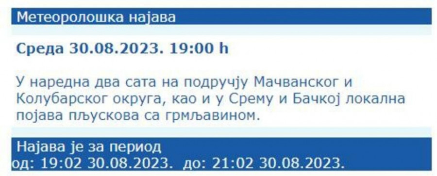 Vremenska prognoza 21:01 29.08.2023 NAJNOVIJE UPOZORENJE RHMZ: Intenzivni pljuskovi praćeni gradom i olujnim vetrom pogodiće OVE REGIJE Srbije u naredna DVA SATA
