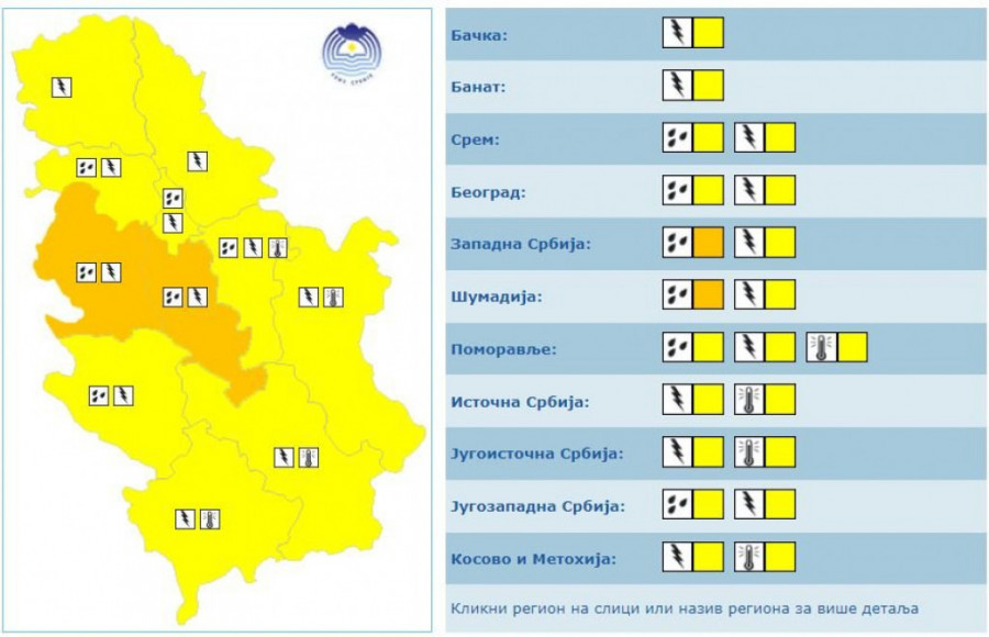 RHMZ OBJAVIO UPOZORENJE: Očekujte pljuskove sa grmljavinom! U jednom delu Srbije vreme će biti OPASNO! Autor: Republika Vesti 03.09.2023 17:08 Pratite nas i putem Android ili iOS aplikacija Narandžasti meteo alarm je na snazi u Šumadiji i zapadnoj Srbiji, dok je ostalim delovima Srbije je na snazi žuti meteo alarm. Foto: Profimedia Na sajtu Republičkog hidrometeorološkog zavoda (RHMZ) objavljeno je upozorenje koje se odnosi na intenzivne pljuskove sa grmljavinom. "Upozorenje za područje Srbije na intenzivne pljuskove sa grmljavinom tokom večeri i noći, kao i sutra tokom dana (za noć 3. na 4. i 4. septembar). Pljuskovi i grmljavine koji se, kao lokalna pojava, od sredine dana očekuju u Vojvodini, u večernjim satima će se intenzivirati prvo u zapadnoj Srbiji, a u toku noći i u ponedeljak i u ostalim krajevima južno od Save i Dunava, uslovljavajući količine padavina od 20 do 50 mm, lokalno i više", navedeno je. RHMZ je takođe objavio i hidrološku najavu. "Na Dunavu od 3. do 6. septembra vodostaji će biti u većem porastu bez dostizanja granica redovne odbrane od poplava", piše na sajtu Republičkog hidrometeorološkog zavoda. Danas su na snazi dva meteo alarma, žuti i narandžasti. Foto: RHMZ/printscreen Narandžasti meteo alarm je na snazi u Šumadiji i zapadnoj Srbiji. "Vreme je opasno. Prognozirane su opasne vremenske pojave, a takvog su inteziteta da mogu prouzrokovati materijalnu štetu i biti opasne po ljude i životinje. Treba biti vrlo obazriv, svestan rizika i redovno informisan o detaljima očekivanih meteoroloških uslova. Pratiti savete koje daju nadležne državne službe", objavljeno je. U ostalim delovima Srbije je na snazi žuti meteo alarm. "Vreme može biti opasno (potencijalno). Vremenske pojave koje su prognozirane nisu neuobičajene, ali je potreban oprez ako planirate aktivnosti koje su izložene meteorološkom riziku. Treba nastaviti sa informisanjem o očekivanim meteorološkim uslovima. Ne preduzimajte nepotrebne rizike", objašnjeno je na sajtu Republičkog hidrometeorološkog zavoda. Bonus video: Poštovani čitaoci, možete nas pratiti i na platformama: Facebook, Instagram, YouTube, TikTok, Telegram, Vajber. Pridružite nam se i prvi saznajte najnovije i najvažnije informacije. Naše aplikacije možete skinuti sa Google Play i Apple AppStore. Tagovi Prognoza vremena Zapadna Srbija RHMZ meteo alarm Grmljavina Prethodna vest Sledeća vest Komentari (0) Vesti 00:02 OVO OSEĆANJE NIKAKO NE SKRIVAJTE U SRCU, JER TAKO SAMO RADUJETE DEMONE: Sveti Josif Isihasta otkriva kako pobediti u borbi s unutrašnjim nemirom Društvo 00:01 HOROSKOP ZA 27. DECEMBAR! Jarčevi - pred bitnom ste odlukom, Rakovi - manje trošite! Vremenska prognoza 23:14 26.12.2025 DETALJNA PROGNOZA ZA PRAZNIKE! U novogodišnjoj noći DEBELI MINUS, a nakon dočeka stiže ŠOK! Evo za kada su meteorolozi najavili sneg i još jače zahlađenje! 23:09 26.12.2025 VLADIKA BAČKI IRINEJ UPOZORAVA: Zapad se odrekao hrišćanstva, Srbija ne sme – Istok je naš istorijski put Društvo 22:47 26.12.2025 PREMINUO POZNATI NOVINAR I UREDNIK! Umro Dragan Štavljanin! Društvo 22:30 26.12.2025 LEPE VESTI IZ ČAČKA! Pronađen Aleksandar (32) koji je nestao u ponedeljak Politika 21:41 26.12.2025 DAVIO, PRETIO SMRĆU I VUKAO PO ZEMLJI ROĐENU SESTRU! Blokader Kariman iz Koceljeve osuđen na šest meseci zatvora uslovno zbog divljačkog ponašanja - GOVORIO I DA ĆE JOJ DECU POBITI! (VIDEO) Društvo 21:38 26.12.2025 JEDINSTVENA MANIFESTACIJA ŠIROM BEOGRADA - NOĆ LEGATA: Večeras od 20 časova do dva iza ponoći muzeji širom otvaraju vrata za posetioce! (FOTO) Politika 21:20 26.12.2025 "OMLADINA SNS JE OD POČETKA NA PRAVOJ STRANI ISTORIJE!" Mihailo Vučević poslao jaku poruku: GENERACIJA SMO KOJA JE OPSTALA I OSTALA ČVRSTO NA NOGAMA! (VIDEO) 21:13 26.12.2025 OVO JOŠ NIJE VIĐENO - PLES NA ŠIPCI USRED HRAMA: Nastup u Crkvi Svete Marije izazvao lavinu komentara (VIDEO) Politika 21:00 26.12.2025 ŠOLAKOVI KERBERI OBJAVLJUJU ZAŠTIĆENE LIČNE PODATKE DA BI PAKOVALI AFERE! Sad im ne smetaju curenje informacija i kršenje zakona! Vremenska prognoza 20:31 26.12.2025 KOLAPS NA PUTEVIMA! SNEG I POLEDICA OKOVALI SRBIJU! Na ovim deonicama je NAJKRITIČNIJE, a evo kakav nas ledeni šok čeka do Nove godine! Politika 20:21 26.12.2025 UDARNA PORUKA IZ SRCA KOSMETA! "Nema podela među nama": Srpska lista otkrila ključ za pobedu, podrška stigla i od sportskog asa! Politika 18:55 26.12.2025 ISTORIJSKI TRENUTAK NA BANJICI! Predsednik Vučić postavlja kamen temeljac za NOVI GENERALŠTAB! Ovo je prvi korak ka TOTALNOJ MODERNIZACIJI, ništa više neće biti isto! Politika 18:21 26.12.2025 MINISTAR VUJIĆ ZAHTEVA HITNO STAVLJANJE VAN SNAGE NEZAKONITOG REŠENJA PREDSEDNIKA VST! Politika 17:59 26.12.2025 SUDBINA SRBIJE NA PREKRETNICI! Vučić uputio nikad važniju poruku narodu: Sudite po delima i donesite odluku HLADNE GLAVE! (VIDEO) Društvo 17:40 26.12.2025 DRAMATIČNA PROMENA U SRPSKOM ZDRAVSTVU! KRAJ BESKONAČNIM LISTAMA ČEKANJA?! Vlada Srbije donela hitnu odluku! Evo šta se menja u svim domovima zdravlja i bolnicama! Politika 16:56 26.12.2025 VAŽNE TEME NA STOLU: Vučić sutra s ambasadorom Ruske Federacije Politika 16:55 26.12.2025 Ministar akademik Balint s ambasadorom Egipta u Srbiji: Podrška naučnoistraživačkom radu kroz saradnju i zajedničke projekte dve zemlje Beograd 16:38 26.12.2025 TOTALNI KOLAPS, BEOGRAD STOJI! Popodnevni špic krenuo usred dana, MOSTOVI SE NE VIDE OD VOZILA! Evo gde su najveći čepovi! Politika 16:22 26.12.2025 POSLE SKANDALA KOMPANIJE "CHERY" U BIH: Kinezi pokreću istragu - traže ko je angažovao srbomrsca za kampanju! Politika 14:44 26.12.2025 MALE PENZIJE, SIROMAŠTVO, NISKE PLATE! Počelo je kukanje u Hrvatskoj - sada su i sami priznali: DRŽAVA NAM JE NA POGREŠNOM PUTU! 14:00 26.12.2025 ZAŠTO DRUGIMA NE TREBA MNOGO PRIČATI O SEBI: Otac Petar objasnio kad slep progleda, nem progovori, a gluv pročuje Politika 13:25 26.12.2025 TO JE DEO ŠIREG PROGONA NA SRB