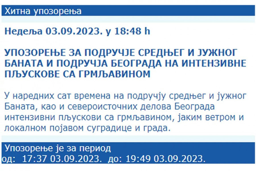 Vremenska prognoza 18:45 03.09.2023 RHMZ IZDAO STRAVIČNO UPOZORENJE! Jaki pljuskovi i sugradica pogodiće ove delove Srbije!
