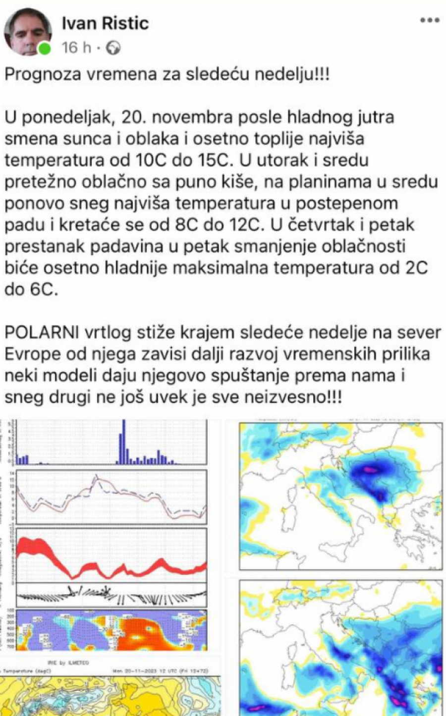 POLARNI VRTLOG SVE BLIŽI SRBIJI! Posle hladnog vikenda, evo KAKVO nas vreme očekuje, meteorolog izneo DETALJNU prognozu! (FOTO) Autor: Republika Vesti 18.11.2023 14:14 Pratite nas i putem Android ili iOS aplikacija Evo kakvo nas vreme očekuje tokom sledeće nedelje! Foto: Tanjug/R. PRELIĆ Hladni front već je zahvatio Srbiju, a meteorolog Ivan Ristić izneo je detaljnu vremensku prognozu za sledeću nedelju. - U ponedeljak 20. novembra posle hladnog jutra, smena sunca i oblaka i osetno toplije, najviša temperatura od 10 do 15 stepeni Celzijusa. U utorak i sredu pretežno oblačno sa puno kiše, na planinama u sredu ponovo sneg. Najviša temperatura u postepenom padu i kretaće se od 8 do 12 Celzijusa. U četvrtak i petak prestanak padavina, u petak smanjenje oblačnosti, biće osetno hladnije, maksimalna temperatura od 2 do 6 stepeni. Foto: Printscreen/Facebook/Ivan Ristić Vremenska prognoza meteorologa Ivana Ristića - Polarni vrtlog stiže krajem sledeće nedelje na sever Evrope, od njega zavisi dalji razvoj vremenskih prilika. Još uvek je sve neizvesno! - naveo je meteorolog Ivan Ristić na svom Fejsbuk nalogu. Na snazi žuti meteoalarm Podsetimo, Republički hidrometeorološki zavod (RHMZ) izdao je upozorenje da će danas u Srbiji duvati jak severozapadni vetar sa udarima olujne jačine od 17 do 24 m/s, odnosno od 60 do 85 km/h, što će u planinskim predelima usloviti mećavu i lokalno stvaranje snežnih nanosa. Foto: RINA Sneg na planinama Na planinama istočne i jugoistočne Srbije očekuje se od 10 do 20 centimetara snega, a u ostalim planinskim delovima zemlje snega će biti manje, navodi RHMZ. Krajem dana i tokom noći padavine će prestati, a vetar oslabiti. U celoj zemlji na snazi je žuti meteo-alarm, što znači da vreme može biti opasno. Vreme za vikend Prema rečima pomoćnika direktora Republičkog hidrometeorološkog zavoda Gorana Mihajlovića, prvi sneg u Beogradu i nižim predelima mogao bi da padne 23. novembra, što se poklapa sa statističkim podacima. Međutim, kratkoročne prognoze ukazuju na to da nas u narednih tri do sedam dana ne očekuje sneg. Foto: Republika/M. JOVANOVIĆ Sneg u Beogradu - Već u toku noći u brdsko-planinskim predelima može da se desi da kiša pređe u susnežicu, zatim u sneg. Mislim na brdsko-planinske predele jugozapadne, zapadne, južne Srbije. Vojvodina, deo Podrinja, Pomoravlje bi bili bez snežnih padavina, dok se u ostalim krajevima, pre svega krajevi iznad 400-500 metara nadmorske visine, može očekivati sneg i formiranje pokrivača - rekao je Mihajlović. Poštovani čitaoci, možete nas pratiti i na platformama: Facebook, Instagram, YouTube, TikTok, Telegram, Vajber. Pridružite nam se i prvi saznajte najnovije i najvažnije informacije. Naše aplikacije možete skinuti sa Google Play i Apple AppStore. Pročitajte i... Društvo 18:23 31.10.2023 PLJUSKOVI I GRMLJAVINA POGODILI SRBIJU! RHMZ najavio širenje nevremena, OVI delovi su sledeći na udaru! Vremenska prognoza 13:14 25.10.2023 TRI LEDENA PERIODA U SRBIJI TOKOM ZIME! Prvi oko OVOG praznika, snega će biti do kolena! Vremenska prognoza 18:43 20.10.2023 ZNA SE KAD NAM STIŽE PRVI SNEG! Zabeležene REKORDNE temperature, meteorolog izneo prognozu! Vremenska prognoza 09:46 17.11.2023 SUTRA SNEG U CELOJ ZEMLJI? Meteorolog otkriva - hladni front prvo stiže u OVE delove, kaputi i topla odeća obavezni! (FOTO) BONUS VIDEO Tagovi Vremenska prognoza Vreme u Srbiji Vreme Najava Ivan Ristić Komentari (0) Vesti Društvo 15:57 HITNO OBAVEŠTENJE: Oglasili se direktorata iz Srbije nakon havarije u Černobilju! Društvo 15:20 SRBIJA I KINA JAČAJU SARADNJU: Beograd domaćin prvog evropskog treninga tradicionalne kineske medicine 14:54 TAJNE KOJE VERNICI NA ISPOVESTI RETKO PRIZNAJU: Sveštenik otkriva zašto se neki koprcaju u blatu, a žele nebeski život Politika 14:22 MONSTRUOZNI KOMENTARI BLOKADERA: Nakon jezivog zlostavljanja dečaka iz Kraljeva osvanule stravične reči, gore od ovoga ne može! (VIDEO) 14:00 ZAŠTO JE VAŽNO DA UJUTRU PRVI STIGNETE U CRKVU: Starac Varsanufije Optinski kaže da je vredno bar pokušati Politika 12:54 GRAĐANI DA NE STRAHUJU: Predsednik Vučić poručuje da će Srbija imati svega dovoljno: Moram da se ponašam odgovorno! (VIDEO) Vremenska prognoza 12:45 NEĆE VAM BITI DOBRO OD OVE PROGNOZE! Evo kada stiže OZBILJNO ZAHLAĐENJE, ali i sneg! Politika 12:39 MAJKA MALTRETIRANOG DEČAKA OGOLILA DUŠU! Dve generacije žrtava! "Stariji sin je trpeo nasilje, a malom Vuku sada ponovo viču ćaci“ 12:38 NAJBOLJA RIBLJA ČORBA KAKVU DANAS RETKO KO SPREMA: Recept jeromonaha Jeroteja otkriva tajnu savršenog ukusa 12:26 MOŽDANI UDAR PREKINUO ŽIVOT SLAVNOG HOLIVUDSKOG GLUMCA: Čuveni filmski negativac pronašao mir u pravoslavlju i na krštenju dobio ime Pantelejmon 12:19 Mađari uvek koriste ovaj TRIK kada hoće da im prženice budu ukusnije od običnih - vredi probati Društvo 11:36 MLADENCI NAKON SVADBE URADILI NEŠTO NEČUVENO: Razotkrili ih na mrežama - "Da sam saznao ovo, to bi bio poslednji put da ih vidim" Politika 10:55 DOKLE IDE LUDILO BLOKADERA? Sramotno i jezivo! Oni podržavaju nasilje i zlostavljanje dečaka (13) iz Kraljeva: "Opravdano ako je MALI ĆACI!" Društvo 10:25 SKANDALOZNO! Građani i "Elektrodistribucija Srbije" trpe zbog interesno-političke grupe! N1 KONZORCIJUM ZA OČITAVANJE BROJILA! Politika 10:20 MESAROVIĆEVA PODELILA SJAJNE VESTI: Japanska poslovna alijansa otvara nove mogućnosti za saradnju sa Srbijom! 10:04 SRPSKA CRKVA DANAS SLAVI SVETOG ALEKSANDRA NEVSKOG: Ratnik koji je vojevao na bojnom polju, a završio kao monah i postao svetac Politika 09:46 EVO ŠTA SU PROIZVELI FAŠISTI BLOKADERI! Bolesnog dečaka Vuka (13) zlostavljali, mučili i terali da viče da je ĆACI! (FOTO, VIDEO) Politika 08:15 KFOR POJAČAO PRISUSTVO NA KiM: „Spremni da odgovorimo na svaki bezbednosni izazov“ Društvo 08:08 OKO 7.500 MLADIH IMA PRAVO NA ISPLATU Oglasio se Siniša Mali, rok je 18. decembar! Društvo 07:40 NA KOJI NAČIN SE PRE