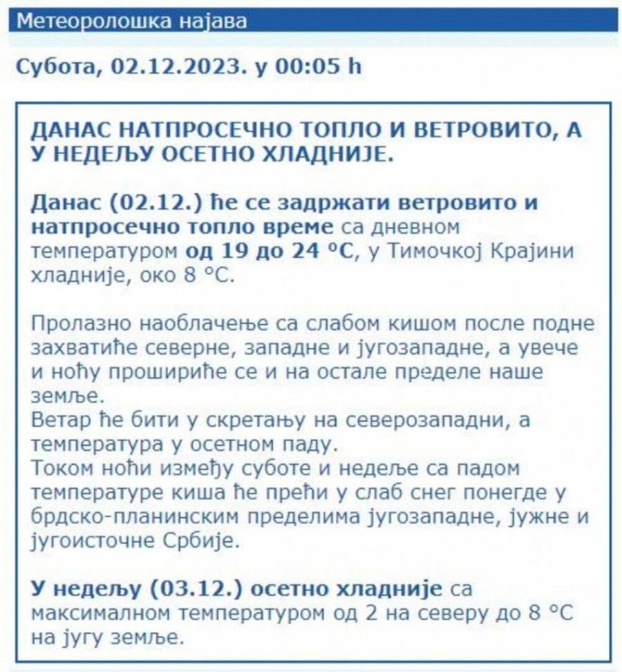 SMENA TOPLIH I HLADNIH DANA DO KRAJA DECEMBRA! Evo kakvo nas vreme očekuje do kraja godine Autor: Republika Vesti 02.12.2023 11:17 Pratite nas i putem Android ili iOS aplikacija Meteorolog Ivan Ristić je izneo detaljnu prognozu za poslednji mesec u godini. Foto: shutterstock Danas će se zadržati vetrovito i natprosečno toplo vreme sa dnevnom temperaturom od 19 do 24 °C, u Timočkoj Krajini hladnije, oko 8 °C. Foto: PRINTSCREEN/RHMZ Meteorološka najava RHMZ Prolazno naoblačenje sa slabom kišom posle podne zahvatiće severne, zapadne i jugozapadne, a uveče i noću proširiće se i na ostale predele naše zemlje. Vetar će biti u skretanju na severozapadni, a temperatura u osetnom padu. Tokom noći između subote i nedelje sa padom temperature kiša će preći u slab sneg ponegde u brdsko-planinskim predelima jugozapadne, južne i jugoistočne Srbije. U nedelju osetno hladnije sa maksimalnom temperaturom od 2 °C na severu do 8 °C na jugu zemlje. A meteorolog Ivan Ristić izneo je detaljnu prognozu za poslednji mesec u godini. Đenovski ciklon nastavlja svoj put preko Balkana na severoistok tako da mi u Srbiji nećemo imati padavine u nedelju 3. decembra, biće pretežno oblačno povremeno sa provejavanjem slabog snega na jugoistoku. Polarni vrtlog, a sa njim i hladan artički vazduh, tokom sledeće nedelje odlazi polako na sever i severoistok i ustupa mesto vlažnom i toplijem vazduhu sa Atlantika. Početkom sledeće nedelje hladno sa minimalnom temperaturom od -5C do 0 °C dok će najviša dnevna biti izmedju 0 °C i 5 °C. Od utorka, a 5. decembra počinje i košava. Od srede 6. decembra porast dnevnih temperatura tako da će najviša dnevna biti izmeđuu 5 °C i 10 °C. Takodje sa otopljenjem u drugom delu sledeće nedelje stižu i oblaci koji donose kišu u nižim i sneg na višim planinama. Foto: Tanjug/Vladimir Šporčić, Printskrin/Youtube/K1TV Meteorolog Ivan Ristić U drugoj polovini decembra ponovo se očekuju prodori hladnijeg vazduha koji mogu doneti pojavu snega i u nižim predelima, a promenljivo vreme uz brzo smenjivanje hladnijih i toplijih dana zadržaće se do kraja decembra. U hladnijim danima najniža temperatura kretaće se od -5 °C do 0 °C a najviša dnevna temperatura kretaće se od 0 °C do 5 °C, u toplijim najniža od 0 °C do 5 °C, a najviša od 5 °C do 10 °C. Ove zime sibirski anticiklon uticaće u nekoliko navrata na vreme u Evropi ali i kod nas i doneće veoma niske temperature i dosta snega većem delu Evrope. Njegov dolazak uslediće najverovatnije posle Nove Godine ali se ne može sa sigurnošću reći da ga neće biti i pre, već u drugoj ili trećoj dekadi decembra. Ukoliko dodje do prodora hladnog vazduha sa istoka temperatura će pasti ispod nule, padaće sneg uz umerene jutarnje mrazeve od -10 °C do -5 °C. Meteorolog je naveo i da, iako ako modeli IRIE i ECMWF ne prognoziraju snežne pahulje u nižim predelima u četvrtak, 7. decembra nadamo se da će poneka da proleti, nulta izoterma je na oko 350m u Beogradu. Poštovani čitaoci, možete nas pratiti i na platformama: Facebook, Instagram, YouTube, TikTok, Telegram, Vajber. Pridružite nam se i prvi saznajte najnovije i najvažnije informacije. Naše aplikacije možete skinuti sa Google Play i Apple AppStore. Pročitajte i... Beograd 10:07 28.11.2023 U ČETVRTAK JESEN, U PETAK PROLEĆE, ZA VIKEND ZIMA! Vreme će totalno poludeti za dva dana - kiša, sneg i 20 stepeni! Vremenska prognoza 11:21 23.11.2023 STIŽE SNEG, PAHULJE U SUBOTU! Polarni vrtlog donosi nam i jedan LEDENI DAN - spremite kape i rukavice! (FOTO) Vremenska prognoza 11:04 18.11.2023 OLUJNI VETAR, MEĆAVA I SNEŽNI NANOSI: Na snazi žuti meteo-alarm, evo šta nam poručuje najnovije upozorenje RHMZ! Vremenska prognoza 09:46 17.11.2023 SUTRA SNEG U CELOJ ZEMLJI? Meteorolog otkriva - hladni front prvo stiže u OVE delove, kaputi i topla odeća obavezni! (FOTO) BONUS VIDEO: Tagovi Ivan Ristić Meteorolog Meteorolog Ivan Ristić Vreme Vremenska prognoza Nova godina RHMZ Republički hidrometeorološki zavod Blic akalamtor Srbija Komentari (0) Vesti 02:01 TRI TAJNE ŽIVOTA KOJE MNOGI OTKRIJU TEK KADA JE KASNO: Jednostavna pravila za one koji traže mir i smisao u svakodnevici 00:02 OVAKVA MOLITVA MOŽE DA ISCELI I NEMOGUĆE: Sveti Jovan Kronštatski svedoči kako je molitvama spasio smrtno bolesnog mladića Društvo 00:01 HOROSKOP ZA 6. DECEMBAR: Bikovi - pred vama je finansijski povoljan period, Strelčevi - ne znate na čemu ste i to vas muči! Društvo 23:49 05.12.2025 VOZAČI, OPREZ ZBOG OVE DVE OPASNE POJAVE! Oglasila se Agencija za bezbednost saobraćaja: Ove tri stvari se STROGO pridržavajte! 23:14 05.12.2025 EVO ZAŠTO JE GREH ČITATI HOROSKOPE: Sveštenik upozorava da ste na taj način u direktnoj vezi sa đavolom i činite prvi korak ka duhovnom posrnuću Politika 21:38 05.12.2025 "MI U SRBIJI SE NE SPREMAMO ZA RATOVE!" Predsednik Vučić poslao jaku poruku naciji: NAŠA DECA NE GINU, NEČIJA GINU, A NEČIJA SE ZA TO SPREMAJU (VIDEO) Politika 21:04 05.12.2025 "GLAS SRBIJE SE ČUJE I UVAŽAVA" - ministar Starović održao više važnih sastanaka u Vašingtonu (FOTO) Politika 21:00 05.12.2025 KAD NE MOGU NIKAKO DA GA POBEDE NA IZBORIMA...! Pet zamki za Vučića, ne zna se KOJA JE VEĆA LAŽ! 20:22 05.12.2025 SRAMAN NAPAD NA KOSOVSKU SVETINJU NA VELIKI PRAVOSLAVNI PRAZNIK: Vandalizam sa fantomkom na glavi - kamere sve zabeležile Društvo 20:00 05.12.2025 SKANDALOZNO! Građani i "Elektrodistribucija Srbije" trpe zbog interesno-političke grupe! N1 KONZORCIJUM ZA OČITAVANJE BROJILA! Vremenska prognoza 18:34 05.12.2025 OPASAN VETAR I GUSTA MAGLA NA PUTEVIMA! Oglasio se RHMZ: Slede dani KADA SE GREŠKE NE PRAŠTAJU, OVI SAVETI MOGU DA VAM SPASU ŽIVOT! 18:29 05.12.2025 ŠTA SA SLAVSKIM KOLAČEM KOJI OSTANE POSLE SLAVE: Otac Dejan o čestom pitanju vernika Politika 17:45 05.12.2025 ŠOK UŽIVO NA N1! Vujo Ilić priznao: VUČIĆ JE U PRAVU! EXPO DIŽE BDP i sledeća godina biće NAJBOLJA! (VIDEO) Beograd 17:45 05.12.2025