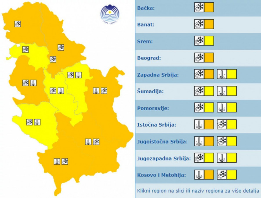 NAJNOVIJE UPOZORENJE RHMZ: Upaljeni meteoalarmi u celoj Srbiji! Autor: Republika/ T. J. Vesti 22.01.2024 15:30 Pratite nas i putem Android ili iOS aplikacija Za sutra meteorolozi upozoravaju i na kišu koja će lediti na tlu. Foto: Printskrin/Youtube/Knjazevačke Vesti U celoj Srbiji će sutra ujutru imaćemo jak mraz, najnovije je upozorenje Republičkog hidrometeorološkog zavoda (RHMZ). Sutra se očekuju i veoma niske temperature, negde i ispod -12, a poseban oprez savetuje se Beograđanima zbog ledene kiše i to u prepodnevnim časovima kada je saobraćaj najfrekventniji. - Na jugozapadu, jugu i istoku Srbije sutra ujutro očekuje se umeren i jak mraz. U većini mesta minimalna temperatura biće od -12 do -8 stepeni Celzijusovih, lokalno i niža - navodi se u meteorološkom upozorenju RHMZ, prenosi Blic. Takođe, za sutra, meteorolozi upozoravaju i na kišu koja će lediti na tlu. - U Vojvodini i zapadnoj Srbiji se sutra ujutro i pre podne uz sneg mestimično očekuje i kiša koja će se lediti na tlu - navodi se na sajtu. Upozorenje RHMZ za Beograd na ledenu kišu - Sutra pre podne (sa najvećom verovatnoćom između 9 i 12 časova) na području Beograda povremeno se očekuju mešovite padavine: sneg i kiša, koja će se u pojedinim delovima grada lediti na tlu. Temperatura vazduha na 2 metra u tom periodu kretaće se od 0 do 2 stepena Celzijusovih, a temperatura pri tlu malo niža - upozorava RHMZ. Upaljeni meteoalarmi Zbog najavljenih vremenskih uslova, u celoj Srbiji za sutra i prekosutra upaljeni su meteoalarmi - veći deo Srbije sutra je u narandžastom zbog snega i leda i niskih temperatura, a u sredu cela Srbija je obojena u žuto zbog snega i leda. Foto: RHMZ/printscreen Delovi Srbije koju su sutra u većem stepenu upozorenja, dakle gde će biti kritičnije zbog snega i leda su - Bačka, Banat, Beograd, Istočna Srbija i Kosovo i Metohija. Ostatak Srbije je pod žutim meteoalarmom. Foto: RHMZ/printscreen Apeluje se na vozače da budu oprezni u vožni zbog poledice na kolovozu. Poštovani čitaoci, možete nas pratiti i na platformama: Facebook, Instagram, YouTube, TikTok, Telegram, Vajber. Pridružite nam se i prvi saznajte najnovije i najvažnije informacije. Naše aplikacije možete skinuti sa Google Play i Apple AppStore. Pročitajte i... Vremenska prognoza 13:44 20.01.2024 VREME SE OZBILJNO IGRA SA NAMA! U jednom delu zemlje SUNCE, u drugom SNEG - OPET SE OGLASIO RHMZ: Upaljen meteo alarm Društvo 09:21 01.01.2024 RHMZ NAJAVIO KIŠU U NAREDNIM DANIMA: U Srbiji je već počela da pada, a evo kada se očekuje u prestonici - Temperature i dalje iznad proseka Društvo 17:48 22.12.2023 METEO-ALARM UPALJEN ZA ČETIRI REGIONA SRBIJE! Stižu sneg i kiša u ove krajeve! NAJNOVIJE UPOZORENJE RHMZ! Društvo 09:37 20.01.2024 U SRBIJI UPALJEN NARANDŽASTI METEOALARM! RHMZ izdao najnovije upozorenje: Evo KAKVO nas vreme očekuje! (FOTO) BONUS VIDEO: Tagovi RHMZ Upozorenje Upozorenje RHMZ Kiša Sneg Led Komentari (0) Vesti 10:04 SRPSKA CRKVA DANAS SLAVI SVETOG ALEKSANDRA NEVSKOG: Ratnik koji je vojevao na bojnom polju, a završio kao monah i postao svetac Politika 09:46 EVO ŠTA SU PROIZVELI FAŠISTI BLOKADERI! Bolesnog dečaka Vuka (13) zlostavljali, mučili i terali da viče da je ĆACI! (FOTO, VIDEO) Politika 08:15 KFOR POJAČAO PRISUSTVO NA KiM: „Spremni da odgovorimo na svaki bezbednosni izazov“ Društvo 08:08 OKO 7.500 MLADIH IMA PRAVO NA ISPLATU Oglasio se Siniša Mali, rok je 18. decembar! Društvo 07:40 NA KOJI NAČIN SE PREPOZNAJU I LEČE GLISTE: Pedijatar Milićević odgovorio na sva pitanja koja muče roditelje! 07:30 ZAŠTO BOG NEKIM LJUDIMA DAJE VIŠE, DRUGIMA MANJE: Vladika Nikolaj objašnjava šta Gospod zaista želi od nas Politika 07:00 PET ZAMKI ZA VUČIĆA! ISPALJUJU LAŽI JEDNU ZA DRUGOM! ČITAJTE U SRPSKOM TELEGRAFU! Društvo 06:26 MENJA SE KURS EVRA Oglasila se NBS sa najnovijom informacijom! Društvo 06:14 OVA STAVKA NE ULAZI U RADNI STAŽ, ALI POVEĆAVA IZNOS PENZIJE Evo o čemu se radi! Društvo 06:01 RHMZ OBJAVIO NAJNOVIJU PROGNOZU: Evo kakva nas temperatura očekuje do kraja nedelje! 02:01 TRI TAJNE ŽIVOTA KOJE MNOGI OTKRIJU TEK KADA JE KASNO: Jednostavna pravila za one koji traže mir i smisao u svakodnevici 00:02 OVAKVA MOLITVA MOŽE DA ISCELI I NEMOGUĆE: Sveti Jovan Kronštatski svedoči kako je molitvama spasio smrtno bolesnog mladića Društvo 00:01 HOROSKOP ZA 6. DECEMBAR: Bikovi - pred vama je finansijski povoljan period, Strelčevi - ne znate na čemu ste i to vas muči! Društvo 23:49 05.12.2025 VOZAČI, OPREZ ZBOG OVE DVE OPASNE POJAVE! Oglasila se Agencija za bezbednost saobraćaja: Ove tri stvari se STROGO pridržavajte! 23:14 05.12.2025 EVO ZAŠTO JE GREH ČITATI HOROSKOPE: Sveštenik upozorava da ste na taj način u direktnoj vezi sa đavolom i činite prvi korak ka duhovnom posrnuću Politika 21:38 05.12.2025 "MI U SRBIJI SE NE SPREMAMO ZA RATOVE!" Predsednik Vučić poslao jaku poruku naciji: NAŠA DECA NE GINU, NEČIJA GINU, A NEČIJA SE ZA TO SPREMAJU (VIDEO) Politika 21:04 05.12.2025 "GLAS SRBIJE SE ČUJE I UVAŽAVA" - ministar Starović održao više važnih sastanaka u Vašingtonu (FOTO) Politika 21:00 05.12.2025 KAD NE MOGU NIKAKO DA GA POBEDE NA IZBORIMA...! Pet zamki za Vučića, ne zna se KOJA JE VEĆA LAŽ! 20:22 05.12.2025 SRAMAN NAPAD NA KOSOVSKU SVETINJU NA VELIKI PRAVOSLAVNI PRAZNIK: Vandalizam sa fantomkom na glavi - kamere sve zabeležile Društvo 20:00 05.12.2025 SKANDALOZNO! Građani i "Elektrodistribucija Srbije" trpe zbog interesno-političke grupe! N1 KONZORCIJUM ZA OČITAVANJE BROJILA! Vremenska prognoza 18:34 05.12.2025 OPASAN VETAR I GUSTA MAGLA NA PUTEVIMA! Oglasio se RHMZ: Slede dani KADA SE GREŠKE NE PRAŠTAJU, OVI SAVETI MOGU DA VAM SPASU ŽIVOT! 18:29 05.12.2025 ŠTA SA SLAVSKIM KOLAČEM KOJI OSTANE POSLE SLAVE: Otac Dejan o čestom pitanju vernika Beograd 17:45 05.12.2025 BEOGRAD U CRVENOM! Popodnevni špic paralisao prestonicu: EVO KOJE TAČKE SU NAJKRITIČNIJE! (FOTO) Politika 17:45 05.12.2025 ŠOK UŽIV
