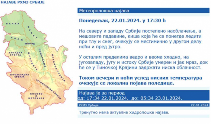 IZDATO NOVO UPOZORENJE RHMZ! U Srbiji upaljena DVA ALARMA - vreme nije naivno, oprez zbog POLEDICE! Autor: Republika Vesti 22.01.2024 20:02 Pratite nas i putem Android ili iOS aplikacija U celoj Srbiji, izuzev jugozapadnog dela, aktivan je žuti meteo alarm, upozoravajući na potencijalno opasne vremenske uslove. Foto: Tanjug/Vladimir Šporčić Republički hidrometeorološki zavod (RHMZ) najavio je da se tokom večeri i noći očekuje lokalna pojava poledice usled niskih temperatura. Na severu i zapadu Srbije očekuje se postepeno naoblačenje, uz mešovite padavine. Kiša koja će se ponegde lediti pri tlu i sneg mogući su mestimično u drugom delu noći i pred jutro. U ostalim predelima očekuje se vedro i veoma hladno vreme, dok će na jugozapadu, jugu i istoku Srbije biti prisutan umeren do jak mraz. U Timočkoj Krajini zadržaće se niska oblačnost. RHMZ ističe da se tokom večeri i noći, zbog niskih temperatura, može očekivati lokalna pojava poledice. Foto: RHMZ/printscreen Najava RHMZ U celoj Srbiji, izuzev jugozapadnog dela, aktivan je žuti meteo alarm, upozoravajući na potencijalno opasne vremenske uslove. RHMZ poručuje da, iako prognozirane pojave nisu neuobičajene, oprez treba zadržati ako se planiraju aktivnosti podložne meteorološkim rizicima. Preporučuje se redovno praćenje informacija o očekivanim meteorološkim uslovima i izbegavanje nepotrebnih rizika, prenosi Mondo. U jugozapadnom delu Srbije je aktiviran narandžasti meteo alarm, dodatno upozoravajući na intenzivnije meteorološke izazove. - Vreme je opasno. Prognozirane su opasne vremenske pojave, a takvog su inteziteta da mogu prouzrokovati materijalnu štetu i biti opasne po ljude i životinje. Treba biti vrlo obazriv, svestan rizika i redovno informisan o detaljima očekivanih meteoroloških uslova. Pratiti savete koje daju nadležne državne službe - objavljeno je na sajtu Republičkog hidrometeorološkog zavoda. Poštovani čitaoci, možete nas pratiti i na platformama: Facebook, Instagram, YouTube, TikTok, Telegram, Vajber. Pridružite nam se i prvi saznajte najnovije i najvažnije informacije. Naše aplikacije možete skinuti sa Google Play i Apple AppStore. Pročitajte i... Društvo 09:37 20.01.2024 U SRBIJI UPALJEN NARANDŽASTI METEOALARM! RHMZ izdao najnovije upozorenje: Evo KAKVO nas vreme očekuje! (FOTO) Vremenska prognoza 07:12 22.01.2024 UJUTRU MRAZ, POPODNE SUNČANO! U toku noći preokret - stiže i sneg, OVO će biti posebno opasno! Vremenska prognoza 09:17 21.01.2024 SRBIJI SLEDUJU DVA "POLARNA JUTRA": Temperatura pada na NEVEROVATNIH -15 stepeni - Upućen oprez zbog MRAZA I POLEDICE Vremenska prognoza 13:44 20.01.2024 VREME SE OZBILJNO IGRA SA NAMA! U jednom delu zemlje SUNCE, u drugom SNEG - OPET SE OGLASIO RHMZ: Upaljen meteo alarm BONUS VIDEO Tagovi Vreme u Srbiji Vremenska prognoza Vreme RHMZ Najava RHMZ Sneg Led Snežne padavine Komentari (0) Vesti Beograd 12:18 KAKAV KOLAPS U CENTRU BEOGRADA! Dečanska ulica blokirana, vozači zauzeli tri trake! (FOTO) Društvo 11:54 DEVOJČICA PUŠILA VEJP, PA POČELA KOŽA DA JOJ SE RASPADA I OTPADA! Dobila stravičnu dijagnozu, pedijatar za Republiku otkrio: U nekim slučajevima dođe i do SMRTNOG ISHODA! Politika 11:24 BLOKADERI BI DA UNIŠTE SRBIJU! Brnabićeva iznela jasan stav: Šalju pisma protiv Srbije, ne znaju koju da izvuku! Društvo 11:10 TELEKOM SRBIJA UVEO NAPREDNU 5G MREŽU KOJU KORISTI SAMO 2 ODSTO EVROPLJANA! Lučić: Revolucija u mobilnim komunikacijama Društvo 11:05 VOZAČI, VAŽNA INFORMACIJA: Objavljene nove cene goriva koje će važiti do 12. decembra! 10:39 ODLUKA DRŽAVE KOJA JE PRIVUKLA PAŽNJU VERNIKA: Zavet monahinje Jefimije izvezen nitima bola dobio pečat večnosti Politika 09:59 IZ PORTE CRKVE U LIPLJANU SKINUTA ZASTAVA SPC! Nadzorna kamera sve snimila: Zastavu je sa zvonare skinula osoba koja je na glavi imala fantomku Društvo 09:34 ZABRINJAVAJUĆI PODACI: Svaka 4. osoba u Srbiji je žrtva digitalnog nasilja i to najčešće žene! Beograd 09:29 AUTOKOMANDA ĆE BITI KRCATA! Radovi na jednoj od najprometnijih soabraćajnica u Beogradu, menjaju se i trase prevoza! Društvo 09:10 Naslov: Pomozimo Luki slanjem 306 na 2407 Društvo 09:04 VAŽNA VEST ZA SVE RODITELJE: Prijave za besplatne novogodišnje paketiće i u ponedeljak! Politika 09:01 PIPER RASKRINKAO PAKLENI PLAN MILOŠA JOVANOVIĆA: Učestvovaće na izborima, potpisaće zapisnik, a onda će reći da ih NE PRIZNAJE! Društvo 08:57 GUŽVE NA GRANICAMA SVE VEĆE: Novi EU sistem produžava čekanja, vozači u problemu! Društvo 08:37 SNEG NEĆEMO VIDETI OVOG DECEMBRA? Iznenađujuća izjava meteorologa! Društvo 08:36 ZA DOČEK DERU KOŽU S LEĐA! Nova godina i do 500 evra po osobi u Beogradu, evo kakve su cene u Srbiji! Politika 08:25 SRBI OTERALI KURTIJA: Od danas ponovo odlučuju o ovim pitanjima! Društvo 07:39 POJAVILA SE ZARAZA U BEOGRADSKIM VRTIĆIMA! Ustanove roditeljima prosledile obaveštenje - CELE PORODICE OBOLELE OD INFEKCIJE! 07:30 JEDINSTVO KOJE NI ĐAVO NE MOŽE RAZBITI: Vladika Nikolaj otkriva šta nas zaista drži na okupu kad sve vuče ka podelama Beograd 06:30 MUŠKARCA (50) UBIO VOZ U ZEMUNU! Hitna pomoć zbog jedne stvari imala PUNE RUKE POSLA! Srbija 06:22 SEDAM SATI ČEKANJA NA GRANICI! Potpuni kolaps na OVIM prelazima, spremite se! Vremenska prognoza 06:05 KIŠA I OLUJNI NALETI KOŠAVE! U Srbiji danas oblačno i tmurno - EVO kada se očekuje razvedravanje! 06:01 VERSKI KALENDAR ZA PETAK 5. DECEMBAR 02:01 ZAŠTO MUSLIMANI PETKOM OSTAVLJAJU SVE I ODLAZE NA ZAJEDNIČKU MOLITVU: Tajna koja vekovima okuplja vernike 00:02 ZAŠTO SE VERNICI DANAS TOLIKO MUČE: Sveti Porfirije otkriva u čemu ljudi obično greše Društvo 00:01 DNEVNI HOROSKOP ZA 5. DECEMBAR: Rakovi ulaze u novo ljubavno poglavlje, Lavovi konačno dobijaju novac, a Strelčevi otkrivaju ko im radi iza leđa Srbija 23:00 04.12.2025 ODVEO SLOBU U HAG, PA SE SKUĆIO U HRVATSKOJ: Ovako je Karlin istražitelj Kevin Kurtis, koji je iznenada preminuo, pokušao da PONIZI Miloševića