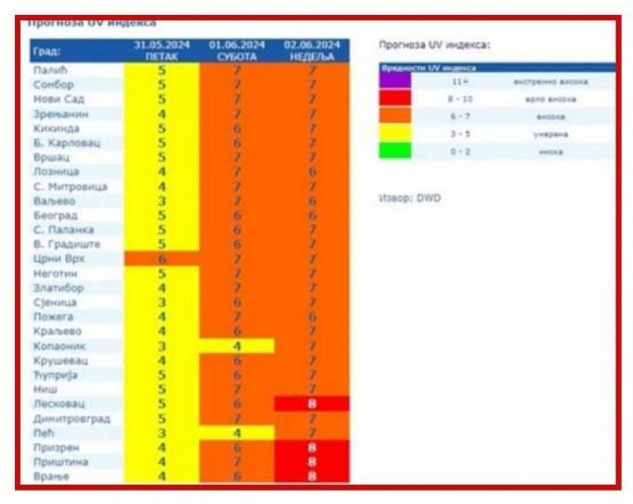 TEŽAK VIKEND PRED NAMA! Spremite se za velike vrućine, lekari upozoravaju na poseban OPREZ zbog jedne pojave Autor: Republika Vesti 01.06.2024 10:50 Pratite nas i putem Android ili iOS aplikacija Srčani bolesnici biti posebno ugroženi Foto: shutterstock, Printskrin/RHMZ Ovaj vikend u Srbiji donosi temperature do 30 stepeni Celzijusa u hladu, što će zbog subjektivnog osećaja biti još toplije. Osim visokih temperatura, očekuje se i visok i vrlo visok stepen UV zračenja, što dodatno povećava rizike za zdravlje. Prema biometeorološkoj prognozi, vreme će biti povoljno za većinu hroničnih bolesnika, ali će srčani bolesnici biti posebno ugroženi. Profesor kardiologije Predrag Mitrović upozorava na mogućnost varijacija krvnog pritiska usled porasta temperatura. Osobe koje već imaju problem sa krvnim pritiskom trebalo bi da prilagode terapiju ili se obrate lekaru ukoliko primete pogoršanje stanja. Foto: Printscreen/RHMZ UV indeks-prognoza Danas su izdata upozorenja za visoko i vrlo visoko UV zračenje širom Srbije, a najjači UV indeks od 8 očekuje se u nedelju u gradovima Leskovac, Prizren, Priština i Vranje, što je vrlo visok nivo zračenja, pretposlednji na skali UV indeksa. Sledeći nivo, ljubičasto, označava ekstremno visoko zračenje. U ostalim delovima Srbije UV indeks će biti između 6 i 7, dok će jedino u Peći i na Kopaoniku UV indeks biti umeren, sa vrednošću od 4. Pritisak će da varira, oprez S obzirom na to da će živa u termometru u hladu za vikend dostizati 30. podeok, prof. dr Predrag Mitrović očekuje varijacije krvnog pritiska. - Oni koji se leče od pritiska znaju da tada treba da promene terapiju. Oni koji se ne leče a imaju skok pritiska, koji će biti najčešće kompromitovan, trebalo bi da se jave kod lekara - savetuje prof. dr Predrag Mitrović za Novosti. On ne očekuje povećan broj srčanih udara, kao u ranijem periodu kada je usled naglih temperaturnih oscilacija do njih dolazilo. Biće razlika u temperaturi, ipak se najavljuje 30 stepeni, ali ne tako velika kao ranije. Međutim, i zbog tolike razlike može da bude problema sa krvnim pritiskom, pre svega - navodi dr. S obzirom na visoke temperature i visok nivo UV zračenja, preporučuje se dodatna opreznost kako bi se izbegli toplotni udar i oštećenja kože. Profesor Mitrović takođe naglašava da, iako ne očekuje povećan broj srčanih udara, varijacije krvnog pritiska su i dalje moguće. Osobe koje pate od hipertenzije trebale bi biti posebno oprezne, a svi koji primete promene u svom stanju trebali bi se obratiti svom lekaru za savet. Dakle, važno je izbegavati direktno izlaganje suncu tokom najjačeg UV zračenja, hidrirati se i preduzeti sve mere zaštite kako bi se smanjili rizici po zdravlje tokom ovog toplog vikenda. Poštovani čitaoci, možete nas pratiti i na platformama: Facebook, Instagram, YouTube, TikTok, Telegram, Vajber. Pridružite nam se i prvi saznajte najnovije i najvažnije informacije. Naše aplikacije možete skinuti sa Google Play i Apple AppStore. Pročitajte i... Vremenska prognoza 09:31 01.06.2024 NOVO UPOZORENJE RHMZ! Stižu nepogode, evo i KADA! Vremenska prognoza 08:13 01.06.2024 PRAVI LETNJI DAN! Sunce i temperatura do 30 stepeni, EVO gde kiša može da iznenadi! Vremenska prognoza 23:41 31.05.2024 RHMZ VEĆ UPALIO ALARME! Stižu grmljavinske nepogode i olujni vetar! Vremenska prognoza 08:07 31.05.2024 PROMENLJIVO I NESTABILNO I DANAS! Spremite se na nove pljuskove, grmljavinu i padavine! BONUS VIDEO: Tagovi RHMZ upozorenje UV zračenje Vremenska prognoza Komentari (0) Vesti Politika 15:47 SKIDANJE ZASTAVE SPC NASTAVAK ISTE KAMPANJE! Kancelarija za KiM: Prištinski političari koriste govor mržnje! Društvo 15:04 NA NOVOM GROBLJU OBELEŽEN 4. DECEMBAR - Dan vojnih veterana Društvo 14:14 Macut posetio Pirot, razgovarao sa gradonačelnikom Vasićem o pokretanju fakulteta 14:00 KAD DOĐU PATNJE I TUGE, UVEK NA UMU IMAJTE OVO! Strac Jefrem Arizonski kaže da tako nikada nećete upasti u očajanje! Politika 13:44 SADAŠNJA OPOZICIJA 2005. DONELA ZAKON KOJI DRŽAVNIM SLUŽBENICIMA ZABRANJUJE BAVLJENJE POLITIKOM! Izmislili da je opština Mionica dala otkaz njihovom kandidatu Društvo 13:11 NI USPORAVANJE PRED KAMARAMA VAS VIŠE NEĆE SPASTI! Od 2026. potpuno nova pravila na srpskim putevima - AKO NE VEŽETE POJAS, PLAĆATE ČAK 50.000 DINARA! 12:46 POSNE BOMBICE MONAHINJE ATANASIJE: Recept koji spaja tradiciju, toplinu, mir i bogat ukus u domaćoj kuhinji Politika 12:40 NI AMERIČKA NI RUSKA, OVO JE SRPSKA LOGIKA! Vučić: Puna energetska bezbednost i sigurnost! Beograd 12:18 KAKAV KOLAPS U CENTRU BEOGRADA! Dečanska ulica blokirana, vozači zauzeli tri trake! (FOTO) Društvo 11:54 DEVOJČICA PUŠILA VEJP, PA POČELA KOŽA DA JOJ SE RASPADA I OTPADA! Dobila stravičnu dijagnozu, pedijatar za Republiku otkrio: U nekim slučajevima dođe i do SMRTNOG ISHODA! Politika 11:24 BLOKADERI BI DA UNIŠTE SRBIJU! Brnabićeva iznela jasan stav: Šalju pisma protiv Srbije, ne znaju koju da izvuku! Društvo 11:10 "TELEKOM SRBIJA" UVEO NAPREDNU 5G MREŽU, KOJU KORISTI SAMO 2 ODSTO EVROPLJANA! Lučić: Revolucija u mobilnim komunikacijama Društvo 11:05 VOZAČI, VAŽNA INFORMACIJA: Objavljene nove cene goriva koje će važiti do 12. decembra! 10:39 ODLUKA DRŽAVE KOJA JE PRIVUKLA PAŽNJU VERNIKA: Zavet monahinje Jefimije izvezen nitima bola dobio pečat večnosti Politika 09:59 IZ PORTE CRKVE U LIPLJANU SKINUTA ZASTAVA SPC! Nadzorna kamera sve snimila: Zastavu je sa zvonare skinula osoba koja je na glavi imala fantomku Društvo 09:34 ZABRINJAVAJUĆI PODACI: Svaka 4. osoba u Srbiji je žrtva digitalnog nasilja i to najčešće žene! Beograd 09:29 AUTOKOMANDA ĆE BITI KRCATA! Radovi na jednoj od najprometnijih soabraćajnica u Beogradu, menjaju se i trase prevoza! Društvo 09:10 Pomozimo Luki slanjem 306 na 2407 Društvo 09:04 VAŽNA VEST ZA SVE RODITELJE: Prijave za besplatne novogodišnje paketiće i u ponedeljak! Politika 09:01 PIPER RASKRINKAO PAKLENI PLAN MILO